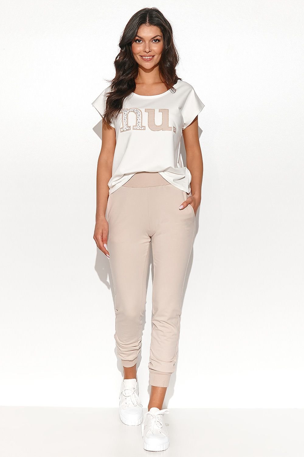 Women's set perfect for the spring-summer season. The lightweight women's blouse has heavily cut sleeves and a rounded deep neckline. It has a casual cut, so it will work for most silhouettes. It features a Numinou logo appliqué on the front, with added zircons. Also included with the blouse are matching women's pants in a beautiful warm shade. The pants have welts in strategic places, making them fit perfectly on a woman's figure. This is a set in which you will spend an active afternoon outdoors or go to work. Style it as you like. Everything is a matter of the accessories you decide on.