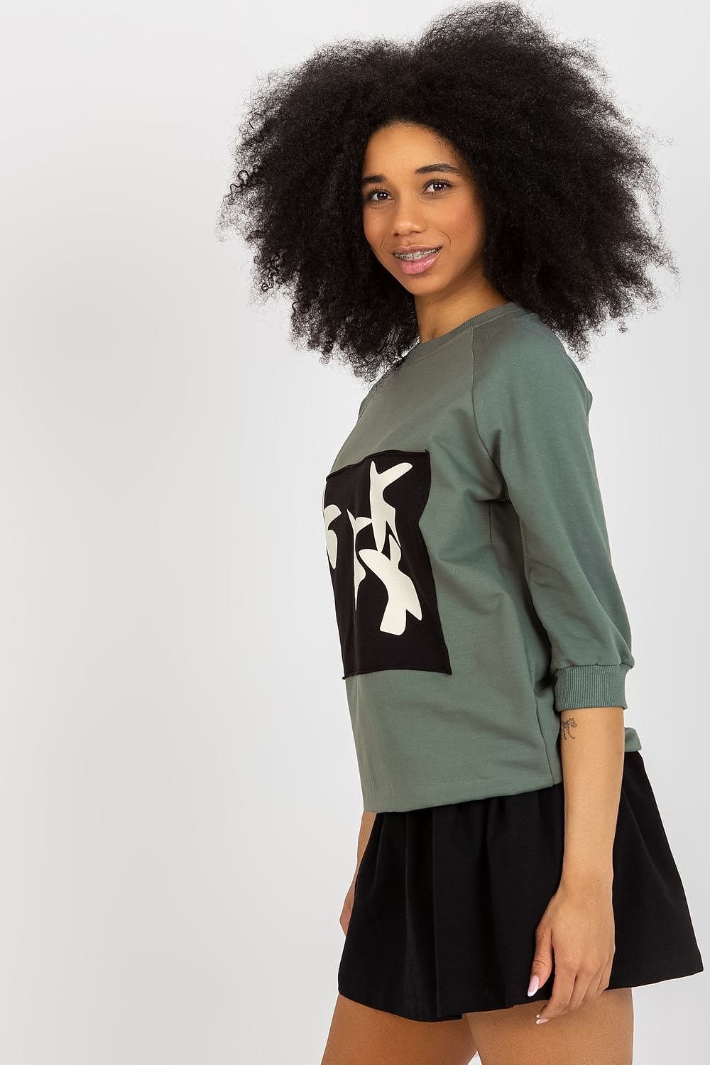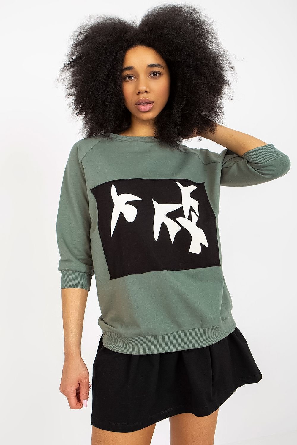 A sweatshirt set consisting of a sweatshirt and a skirt. Blouse with 3/4 sleeves and round neckline. Decorative print on the front. Skirt with higher waist, zipper and button closure.