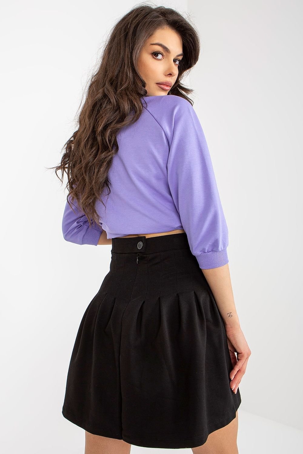 A sweatshirt set consisting of a sweatshirt and a skirt. Blouse with 3/4 sleeves and round neckline. Decorative print on the front. Skirt with higher waist, zipper and button closure.