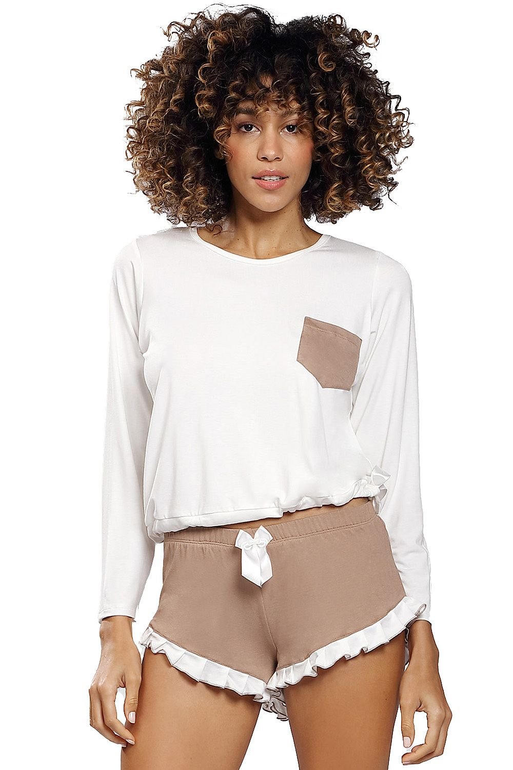 The viscose set Ronnie consists of a light-colored long-sleeve blouse with a brown pocket and shorts trimmed with a frill. The whole set looks delicate and girly. The bottom of the shirt is adjustable with a satin ribbon. The chemise comes in a looser version in any size. Add a touch of luxury to your nightwear closet with our viscose set. It is decorated with a delicate frill, making it perfect for special occasions or just a relaxing evening at home. Made of high quality viscose, this set is soft and comfortable to wear all night long.