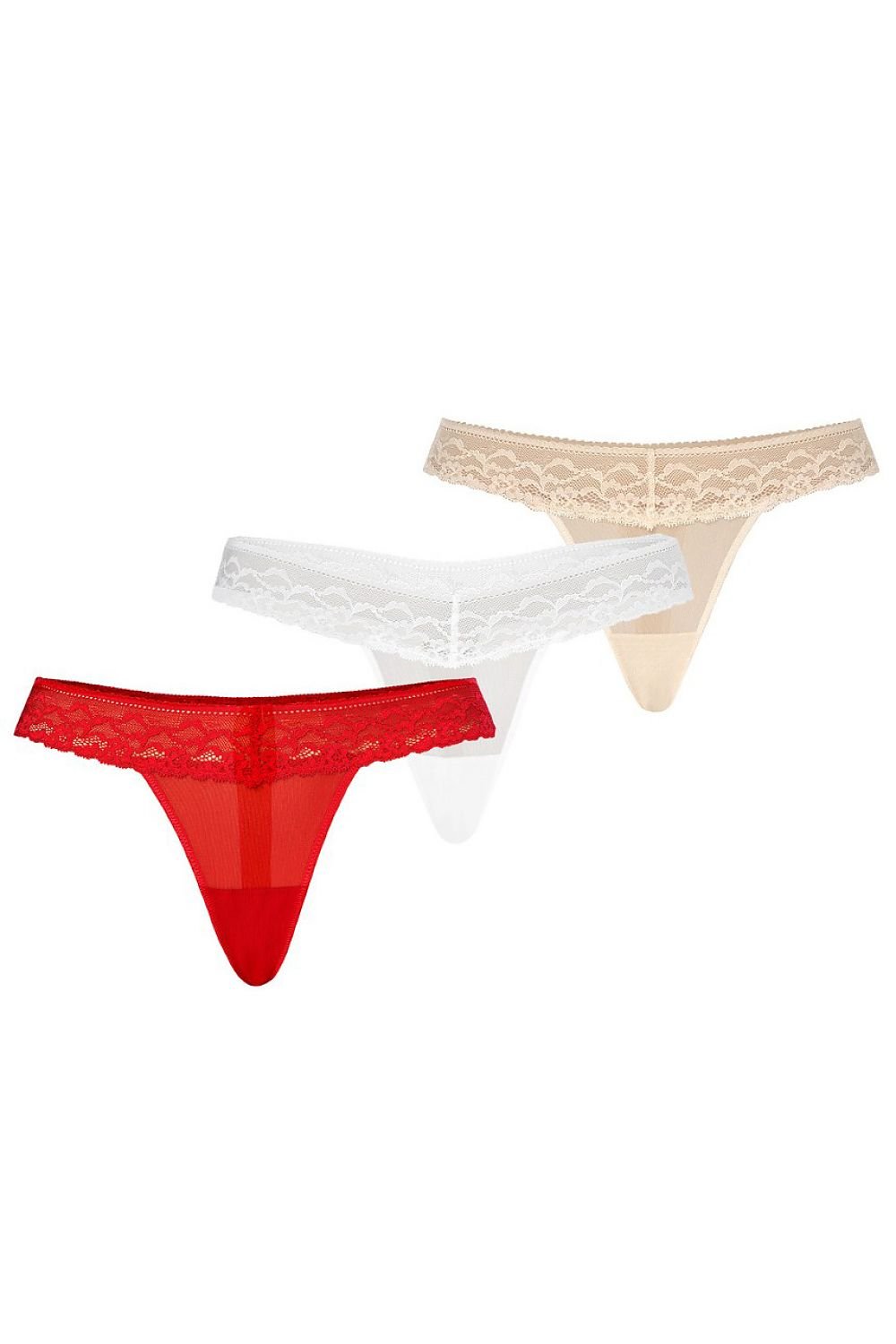 A tri-pack of striking women's thongs made of see-through mesh and lace that wraps around the hip line. The thong in the multipack comes in three colors, juicy red, beige, which works well under white clothing because it is invisible, and white. A mesh with a very fine weave decorates the front of the panties and is triangular in shape. At the back, an extension of the lace is a strap that hides between the buttocks. The sets are very popular among buyers, as their price is very encouraging.