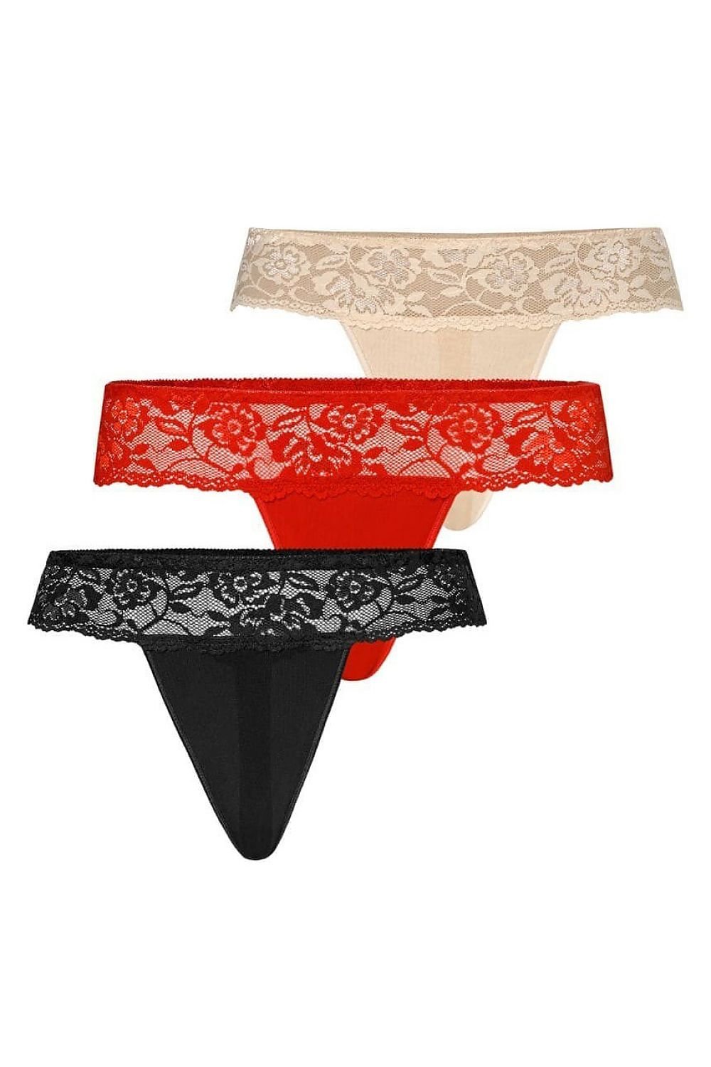 Set of 3 pairs of mesh and lace thong panties in three colors black beige and red. Women's panties are made of high-quality, airy, dense mesh with a fine weave and elastic lace that perfectly fits the figure. Multi-packs of panties are eagerly purchased by customers because their price is attractive, and they are an excellent gift idea.