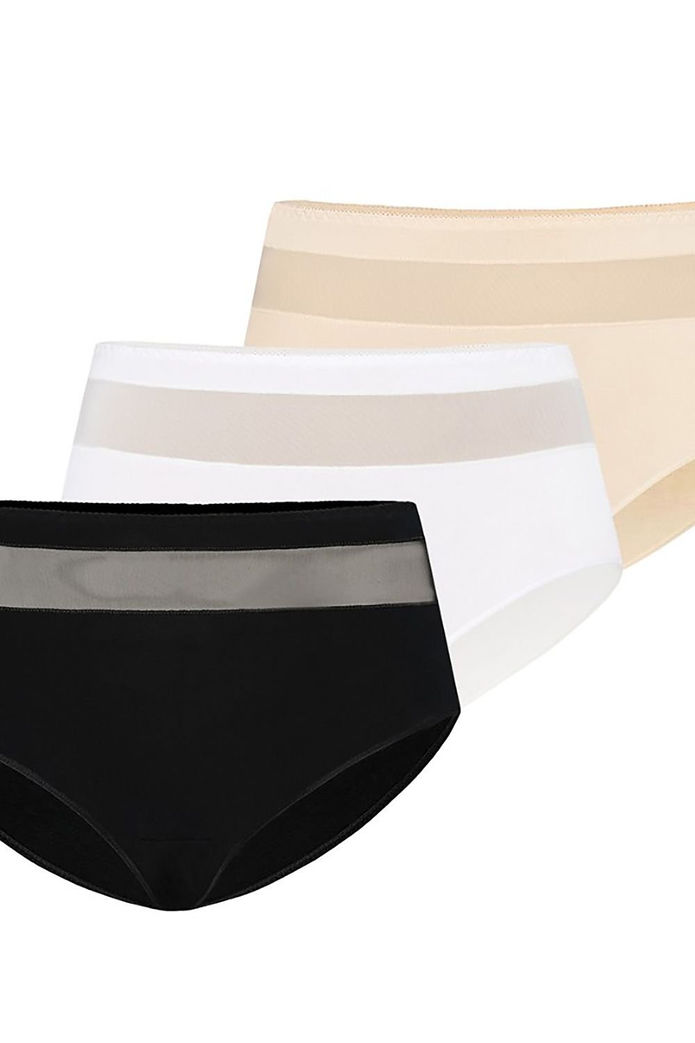 Multi-pack of women's cotton panties with elastic Lycra thread in three base colors black, white and beige. The beige color of the panties will work well under a white dress or pants, as the natural color will blend with the skin tone and be invisible. White color will work well under pastel colors black under dark colors. The briefs in the set have a high waist that reaches halfway to the navel and the sides are built up higher to mask the sides. The high top masks the imperfections of the figure and emphasizes the silhouette, which looks perfect in clothes. Panties at the waist and around the thighs and on the buttocks are finished with a delicate elastic band, which does not leave marks on the skin, does not cut the buttocks and does not rub. In the area of the crotch on the inside of the panties are lined with a double layer of cotton, which guarantees the maintenance of freshness during use. A tri-pack of women's panties is an excellent gift idea for your woman. On the front, the panties are decorated with a see-through fine-weave mesh, which is sewn horizontally between the layers of fabric. Sets of women's panties in three colors are a necessary must have in the closet of any woman who likes to look good every day.