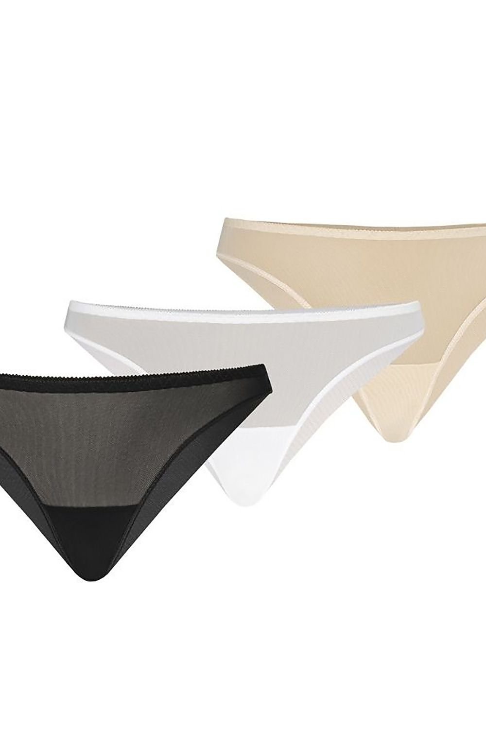 Tri-pack of Tati women's Brazilian panties set in three basic base colors of white, beige and black, at a much lower price and good quality. Multipack sets are eagerly purchased by female customers and very popular. Brasiliana panties so loved by women because of their cut are sexy, exposing the buttocks and effectively exposing the bottom. They are made of transparent high-quality double mesh, which is seamless and the panties are invisible from under the outer garment. The set includes panties in natural color, sensationally work well under white shorts or pants, because the color blends with the color of the skin and does not show through. Brazilians are cut tightly on the thighs, which gives the effect of optical slimming and elongation of the legs. The panties by their appearance resemble thongs, as they expose the buttocks and expose the bottom. For the sake of women's comfort, the panties are lined in the crotch area from the inside with a double layer of breathable cotton, which absorbs moisture and guarantees comfort in use. On the back of the panties there is a vertical cut, which raises the buttocks and exposes them. They are addressed to ladies who love striking underwear and without decorations. They should not be missing in the closet of every woman.