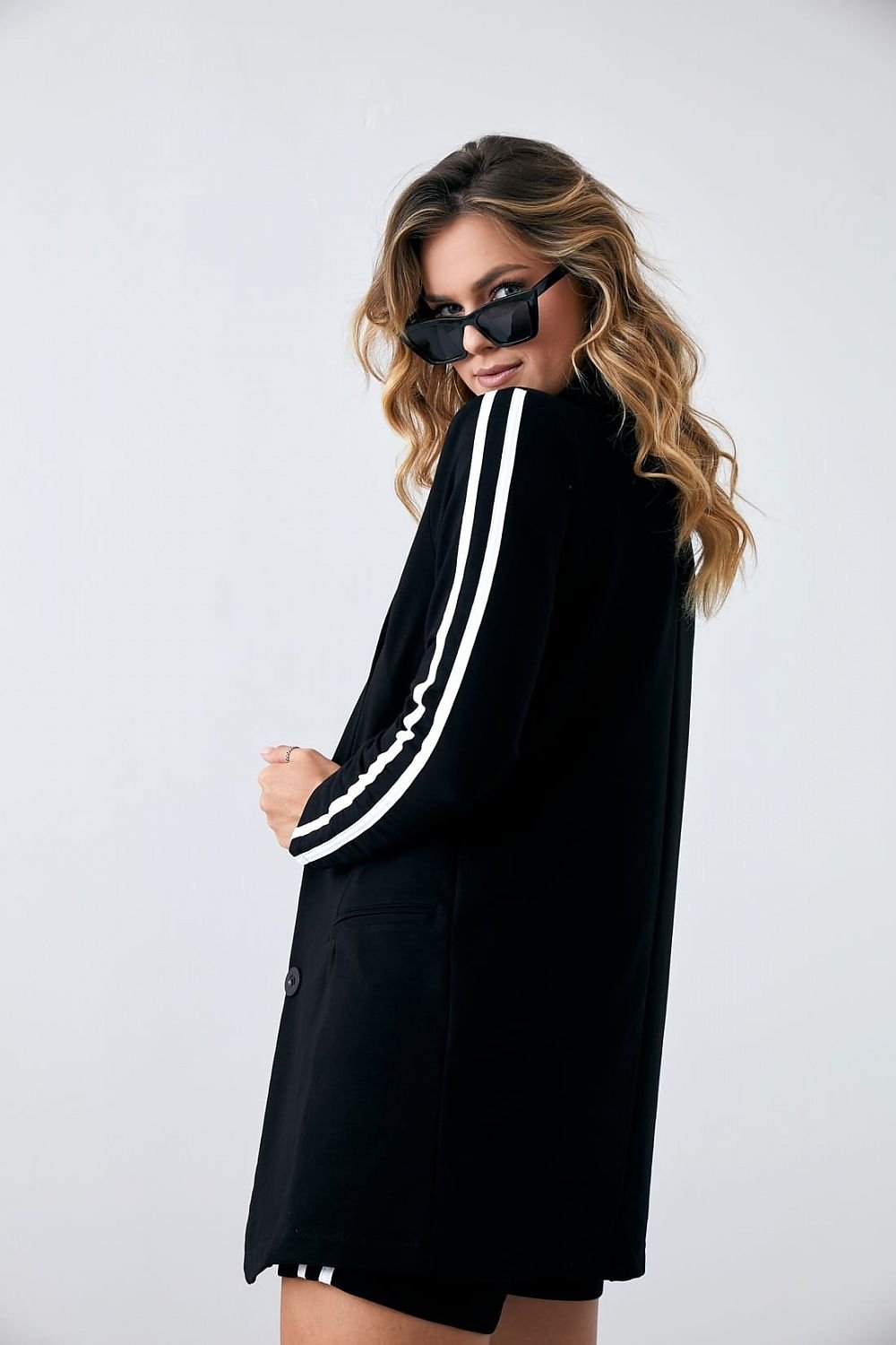 Looking for an original styling? Opt for a black cotton set with decorative stripes. Simple lined jacket with long sleeves buttoned. On the shoulders sewn pillows. Short shorts zipped and buttoned, with elastic at the back. The set is decorated with contrasting stripes.