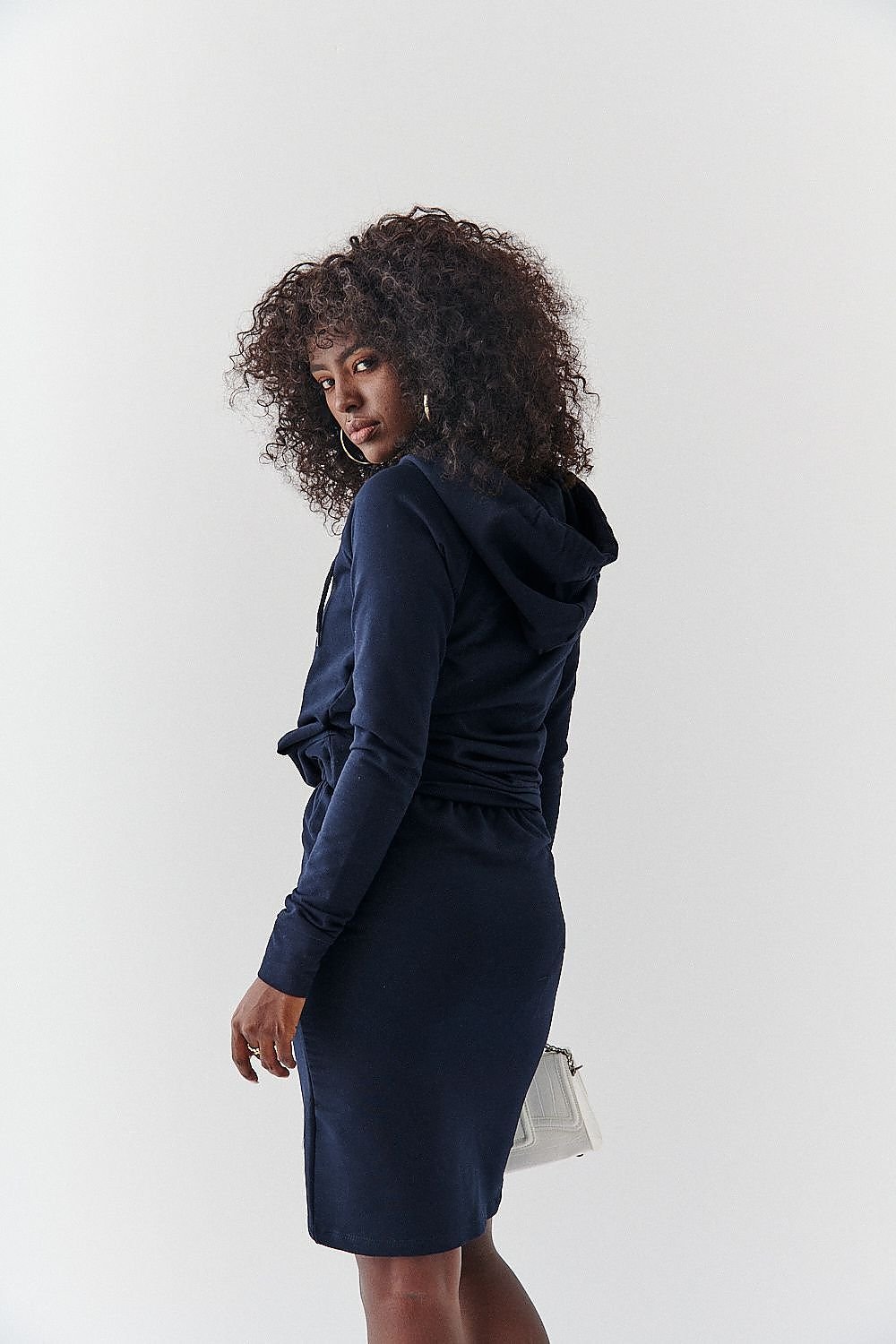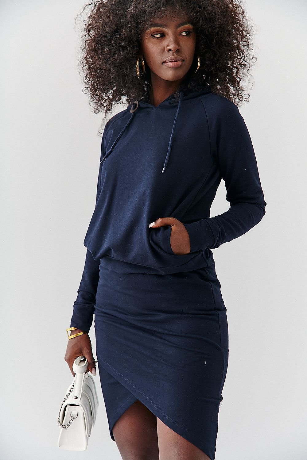 The navy blue set will be perfect for days when you have no idea how to style it. Sweatshirt with hood, long sleeves and pockets. Asymmetrical skirt with an envelope front and an elastic waistband. This model will allow you to experiment and create endless styling.