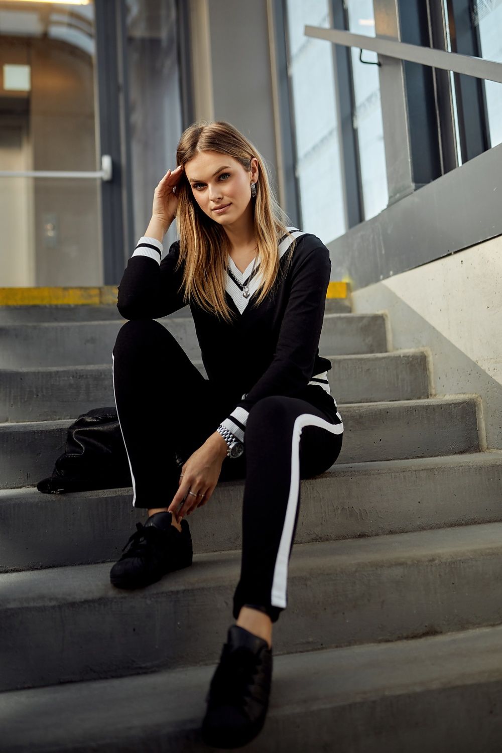 Sporty tracksuit set in black. Sweatshirt with a deep "V" neckline on the front and on the back finished with a white welt. With long sleeves. Sweatshirt finished with a wide hem at the bottom and at the sleeves. Pants with an elastic waistband and a drawstring tie. Long, slightly tapered legs with pockets on the front and piping on the sides. The set is made of thin, stretchy cotton knit fabric. An indispensable part of a woman's closet. Want to feel fashionable and comfortable, this tracksuit is perfect for you.
