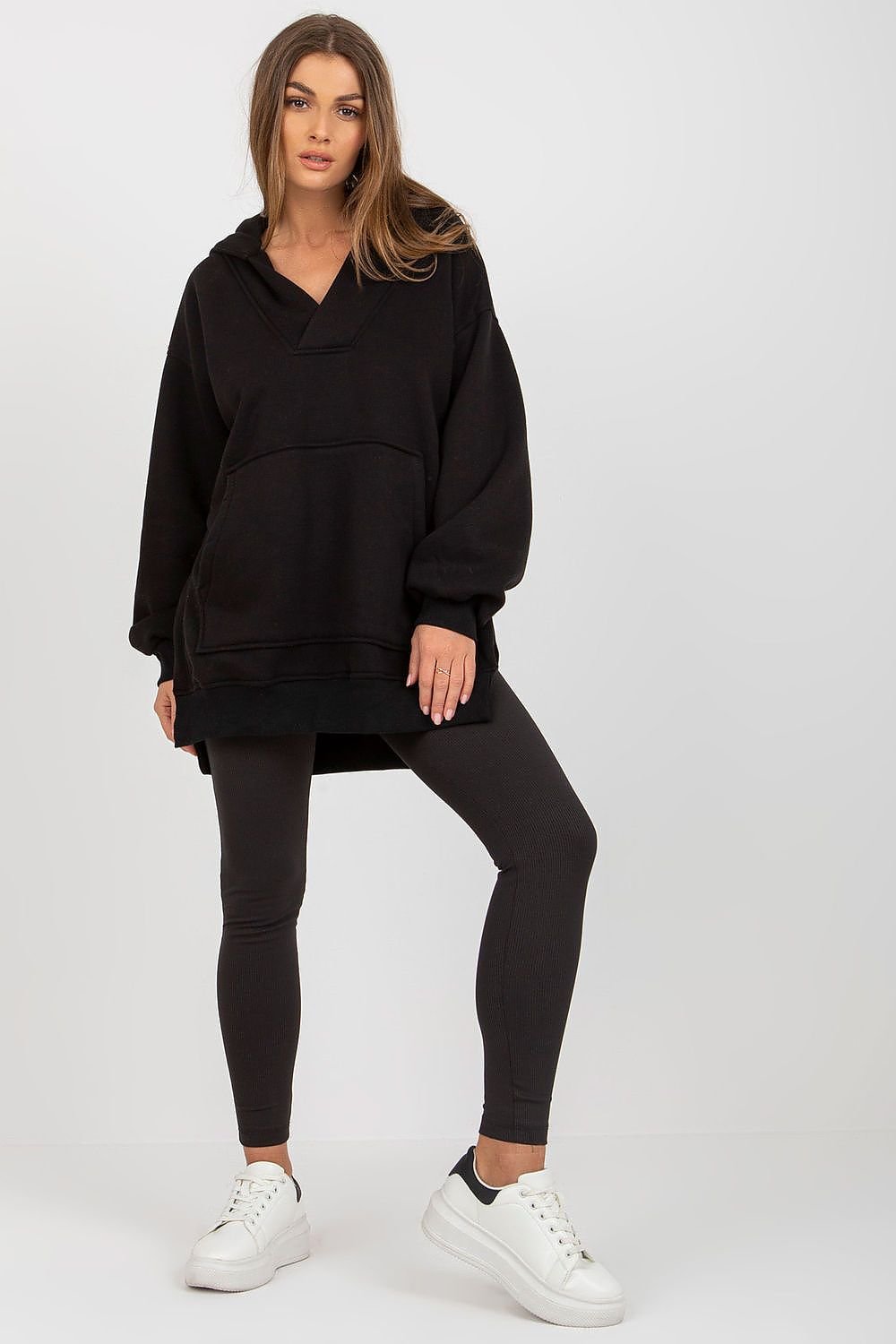 This extended sweatshirt and leggings create the perfect set of casual comfort and style. The long-sleeve sweatshirt with a V neckline is perfect for everyday wear. The high waistline of the leggings guarantees comfort, while the tapered legs add elegance. The kangaroo pocket on the front of the sweatshirt is a practical addition for colder days. In addition, the leggings are made of ribbed material, which gives them a unique character. This set is perfect for casual occasions, providing comfort and style in one.