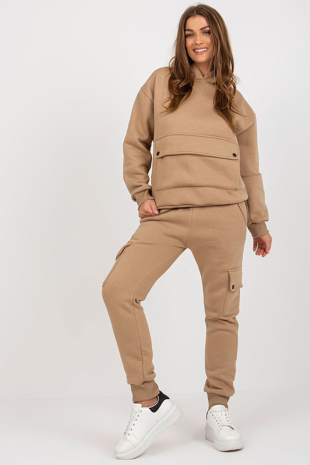 This set is an ideal choice for those who appreciate comfort and casual style. It consists of a sweatshirt and pants, creating a complete set for various occasions. Hooded sweatshirt with long sleeves is a great option for colder days. The hood adds a sporty touch, while the long sleeves provide warmth. On the front of the sweatshirt is a pocket with a flap, which gives it a bit of a military style. The cargo type long pants are not only comfortable, but also very practical. They have slip pockets that hold many small items, as well as thigh pockets that give them a distinctive look. In addition, the pants have a tie at the waist, which allows you to adjust them to your condition. This is a set that will work well for both everyday wear and outdoor activities.