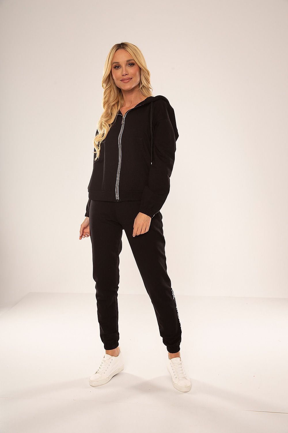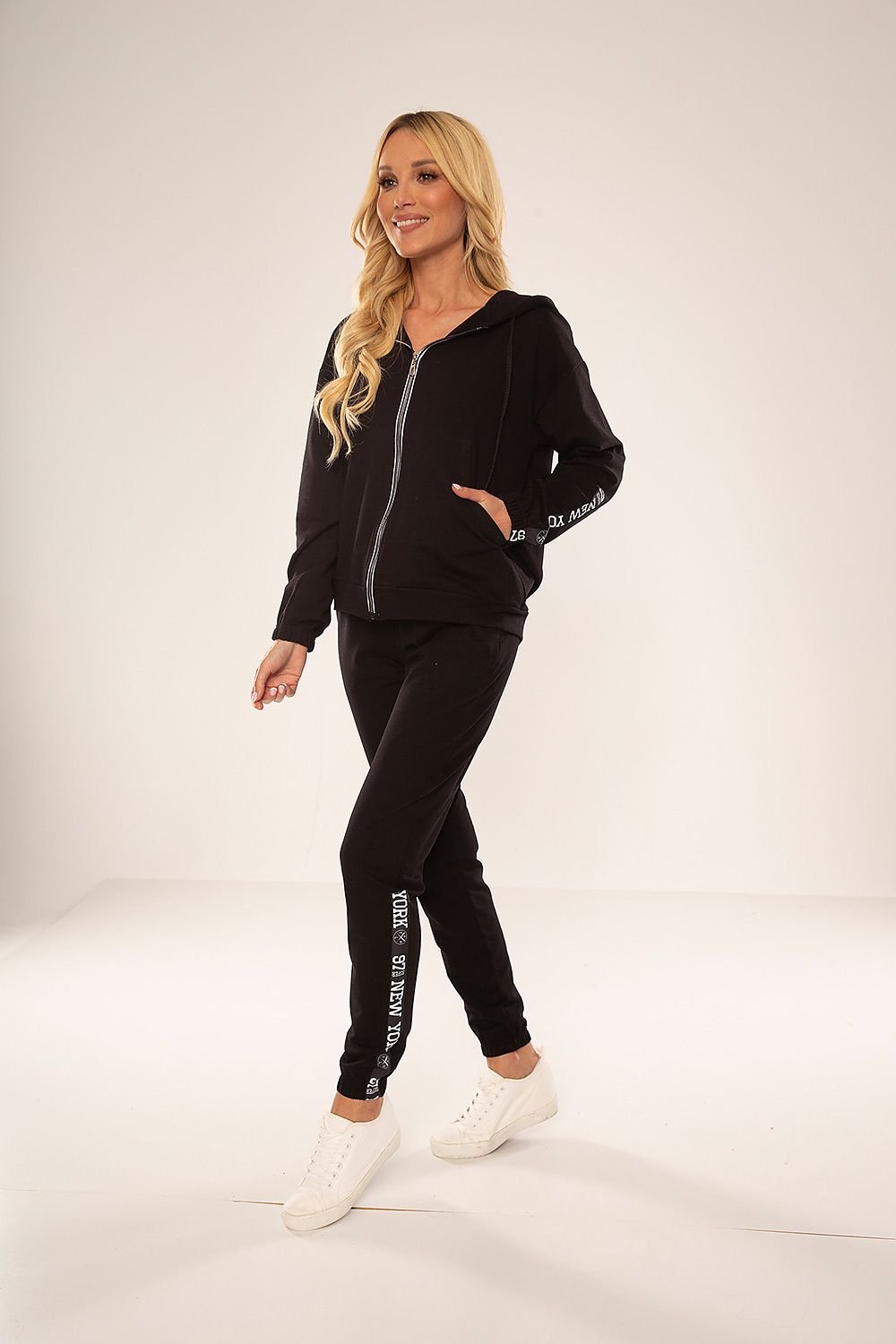 Fashionable women's tracksuit in black. Zippered sweatshirt with slip pockets and hood. Sweatshirt and pants decorated with a chic lampas with the inscription New York. Comfortable pants finished with a drawstring waist, with zippered pockets.