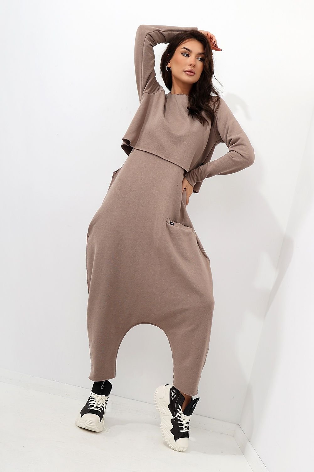 Brown cotton jumpsuit distinguished by striking wide legs. Strapless jumpsuit to complete with a short sweatshirt. On the front of the suit a pocket. The set is finished raw. This proposal will present itself really phenomenal and elegant!