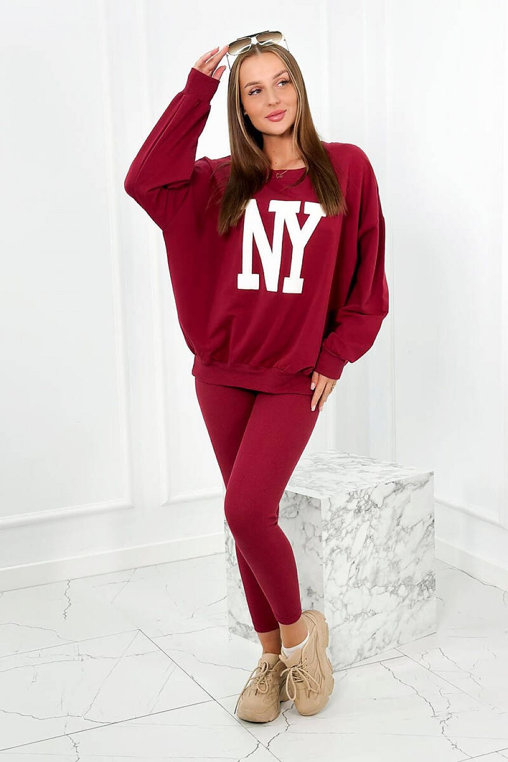This maroon set, consisting of a sweatshirt and leggings, is an excellent choice for those looking for a stylish and comfortable outfit. This combination provides both a fashionable look and comfortable wear.