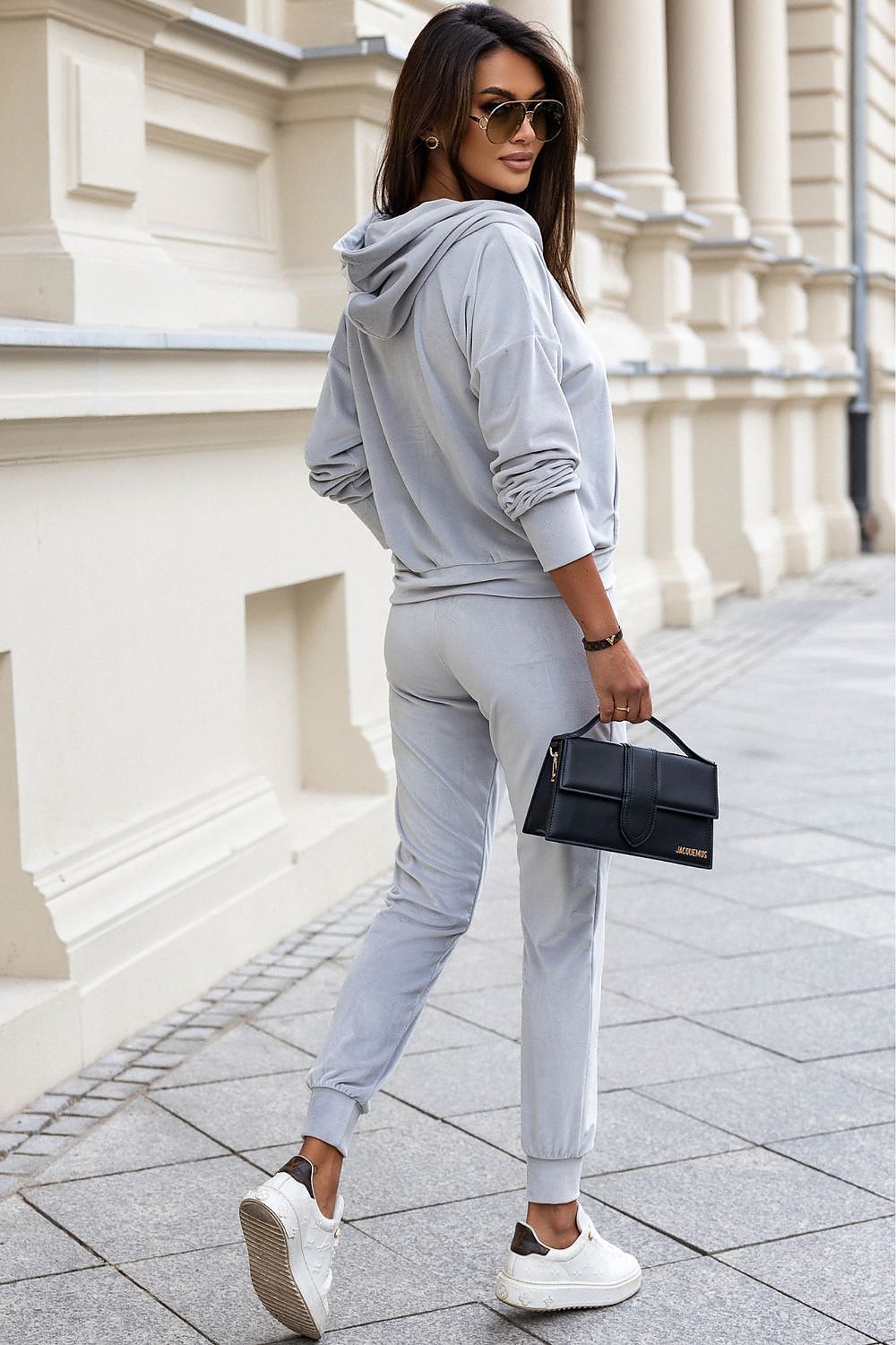 Kanya is a tracksuit sewn from extremely pleasant, very stretchy velour. We give you our word that you won't want to take it off! The upper part of the tracksuit is an unbuttoned sweatshirt with a hood and a kangaroo pocket, where you can easily fit your phone or wallet. The long sleeves, which you can freely roll up, are finished with a wide cuff. The pants have narrow, but not tight, long legs, which will emphasize your curves and make you feel really feminine in our tracksuit. They feature a drawstring waist and legs. You can easily combine the Kanya set with other parts of your closet or mix it with our other tracksuits. Go for it! Tracksuit set designed and sewn in Poland. Important! The velour has a non-uniform color. The elastic at the waist stretches up to 10 cm. The length in the table refers to the blouse.