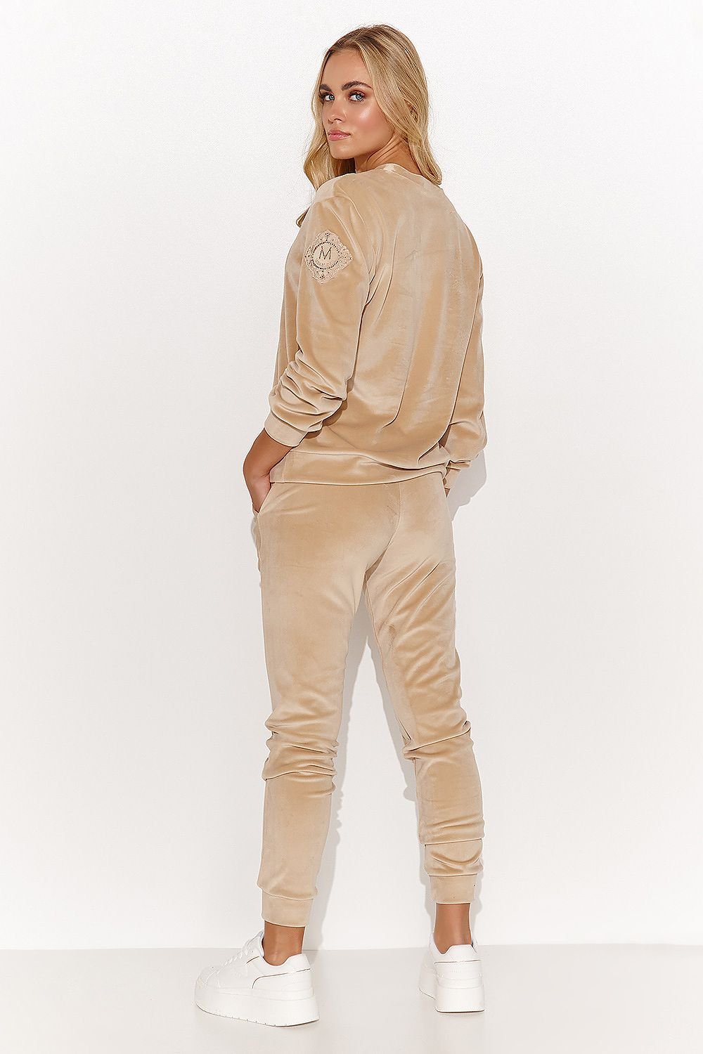 Elegant and feminine velour knit tracksuit set is a combination of cozy comfort and chic style. This unique set is distinguished by hems that add a luxurious charm. The sweatshirt is tucked in over the head and features a heart neckline that accentuates the collarbones. In addition, it has long sleeves. On one of the sleeves you'll find an elegant patch with the Macadamia logo, which adds originality to the set. The pants have a tapered leg finished with a drawstring hem. In addition, there are practical slip-in side pockets on the sides of the pants, which add functionality to this set. This set is perfect for many occasions. The magic is in the details, that is, the accessories you choose to match it. You can wear it every day, to work, or to evening meetings, while maintaining your unique style.