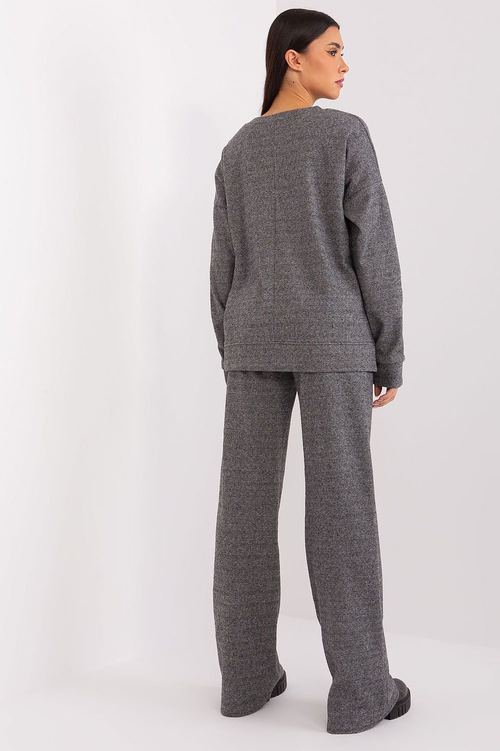 Casual women's set consisting of a blouse and pants. Sweatshirt of a looser cut with long sleeves and a heart-shaped neckline. Long pants with wider legs with an elastic band and binding at the waist.