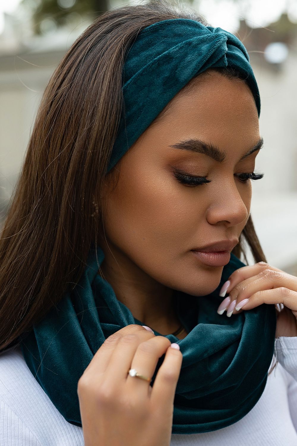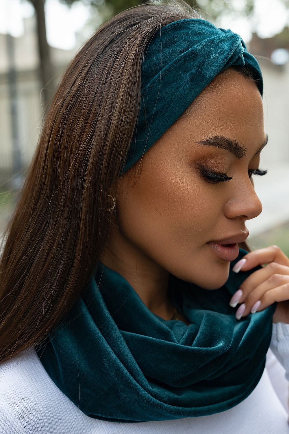 A unique headband and chimney set available in a wide range of colors. Everyone will choose something for themselves. The set without patterns with a universal cut will fit into most autumn and winter outfits. Made of high-quality soft and pleasant velour, which perfectly adapts to the circumference of the head. On the front of the headband decorative interlacing with a knot. Ideally suited as a gift for a loved one. This set is a guarantee of the highest quality at a very attractive price. Set of headband and chimney sweater designed and sewn in Poland.