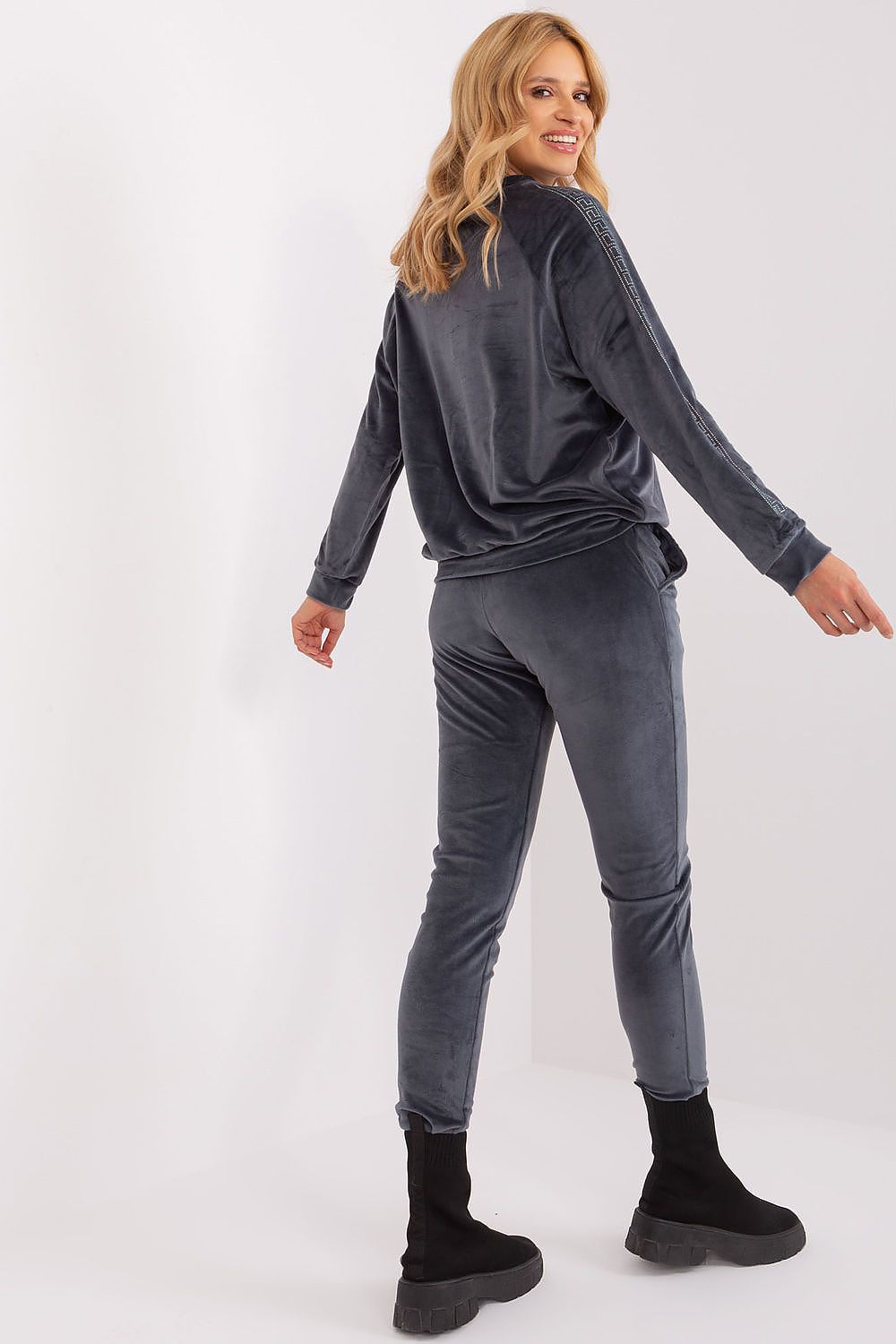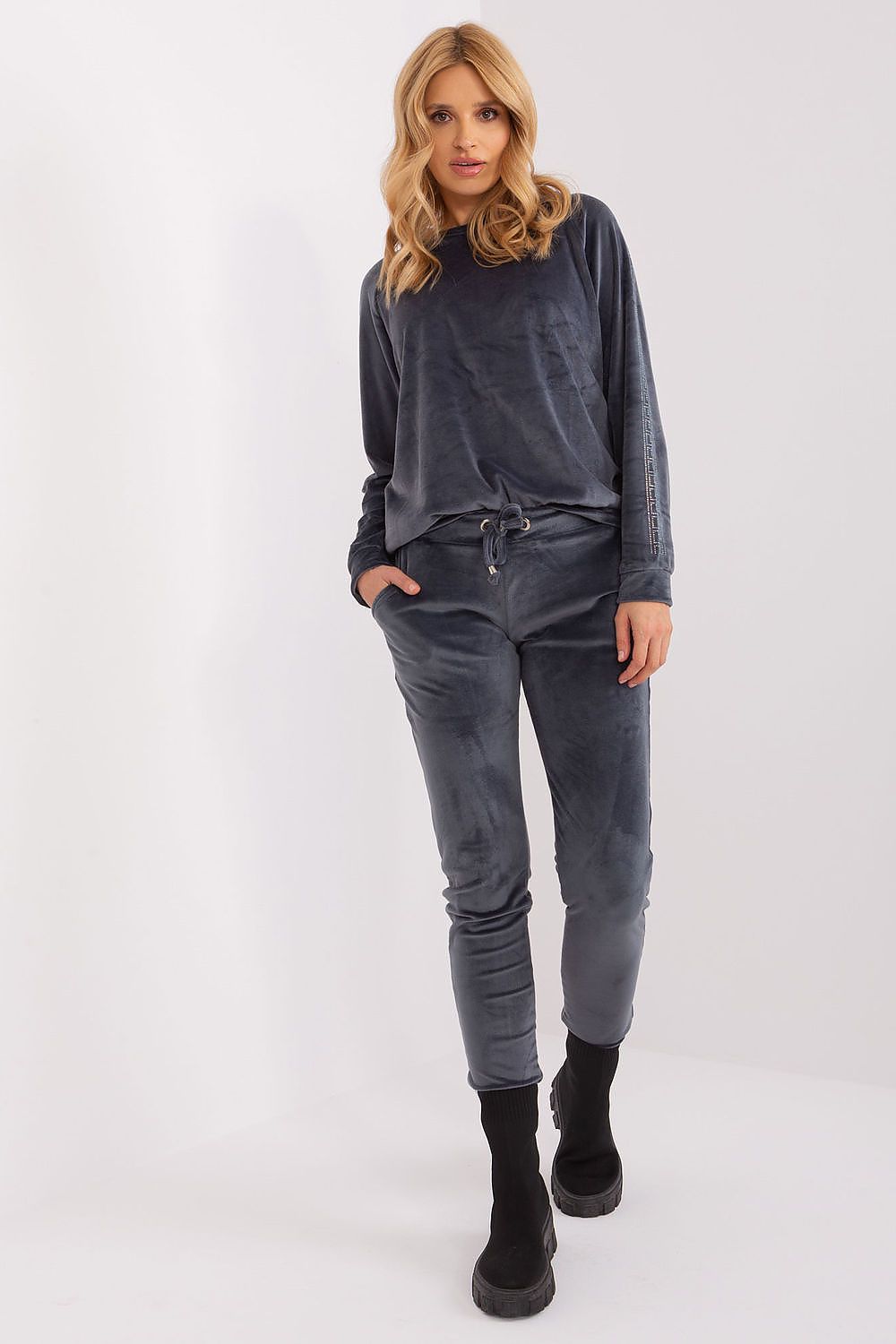 Velour set consisting of a blouse and long pants. Blouse with long sleeves and round neckline. Long pants with a tie at the waist, with slip pockets on the sides. Sleeves decorated with a pattern of rhinestones.