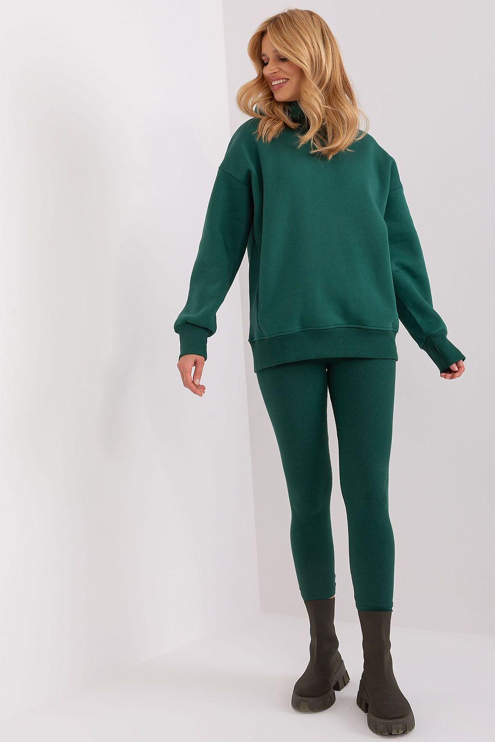 This women's set is a combination of fashionable design and unparalleled comfort, providing a unique look and freedom of movement. The sweatshirt is the quintessential casual style. With long sleeves and a hood, it gives a sense of coziness and protection from the cold. The sleeves and hem of the sweatshirt are finished with a ribbed hem, which gives the whole set a modern touch. The leggings in this ensemble are distinguished by the ribbed material, which gives them a subtle, textural look. The high rise of the leggings makes them perfectly accentuate the silhouette, while the wide ribbed waistband guarantees a perfect fit and wearing comfort. The wide drawstring waistband of the leggings not only adds originality, but also provides flexibility and a perfect fit for individual preferences. High-quality materials used in the production of this set guarantee not only an attractive appearance, but most importantly freedom of movement and comfortable wearing. This is an excellent choice for an active day or a relaxing evening. This women's set is an option for women who appreciate comfort, while not giving up on fashion expression. Ideal for many occasions, from home relaxation to meeting with friends.