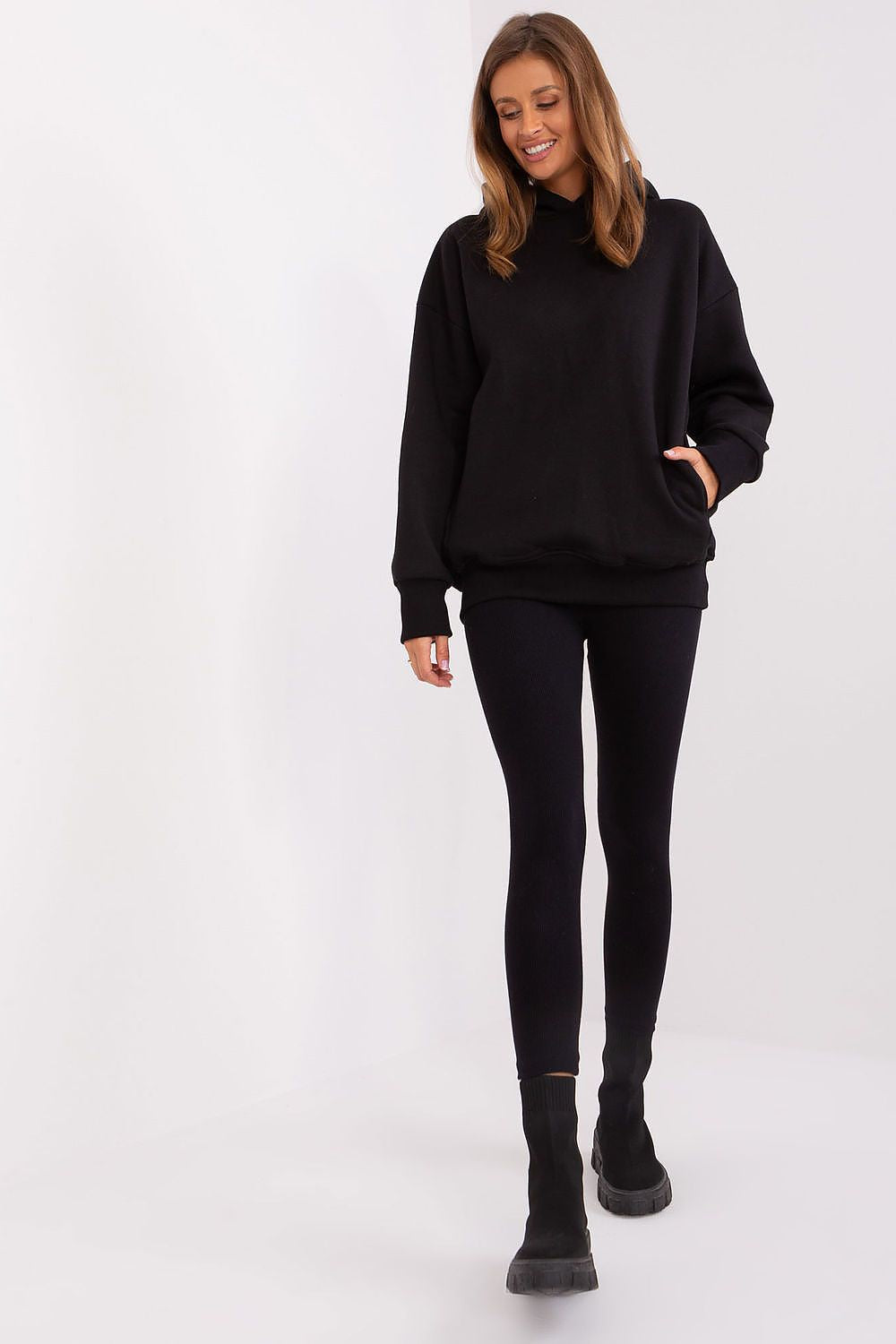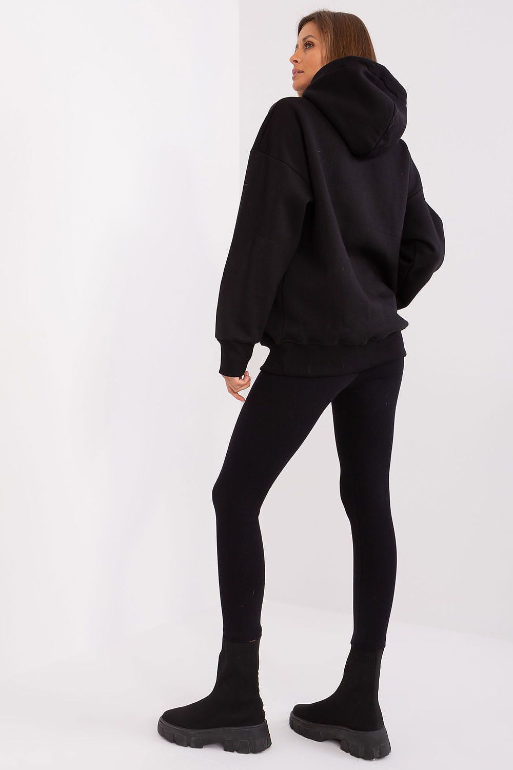 This women's set is a combination of fashionable design and unparalleled comfort, providing a unique look and freedom of movement. The sweatshirt is the quintessential casual style. With long sleeves and a hood, it gives a sense of coziness and protection from the cold. The sleeves and hem of the sweatshirt are finished with a ribbed hem, which gives the whole set a modern touch. The leggings in this ensemble are distinguished by the ribbed material, which gives them a subtle, textural look. The high rise of the leggings makes them perfectly accentuate the silhouette, while the wide ribbed waistband guarantees a perfect fit and wearing comfort. The wide drawstring waistband of the leggings not only adds originality, but also provides flexibility and a perfect fit for individual preferences. High-quality materials used in the production of this set guarantee not only an attractive appearance, but most importantly freedom of movement and comfortable wearing. This is an excellent choice for an active day or a relaxing evening. This women's set is an option for women who appreciate comfort, while not giving up on fashion expression. Ideal for many occasions, from home relaxation to meeting with friends.