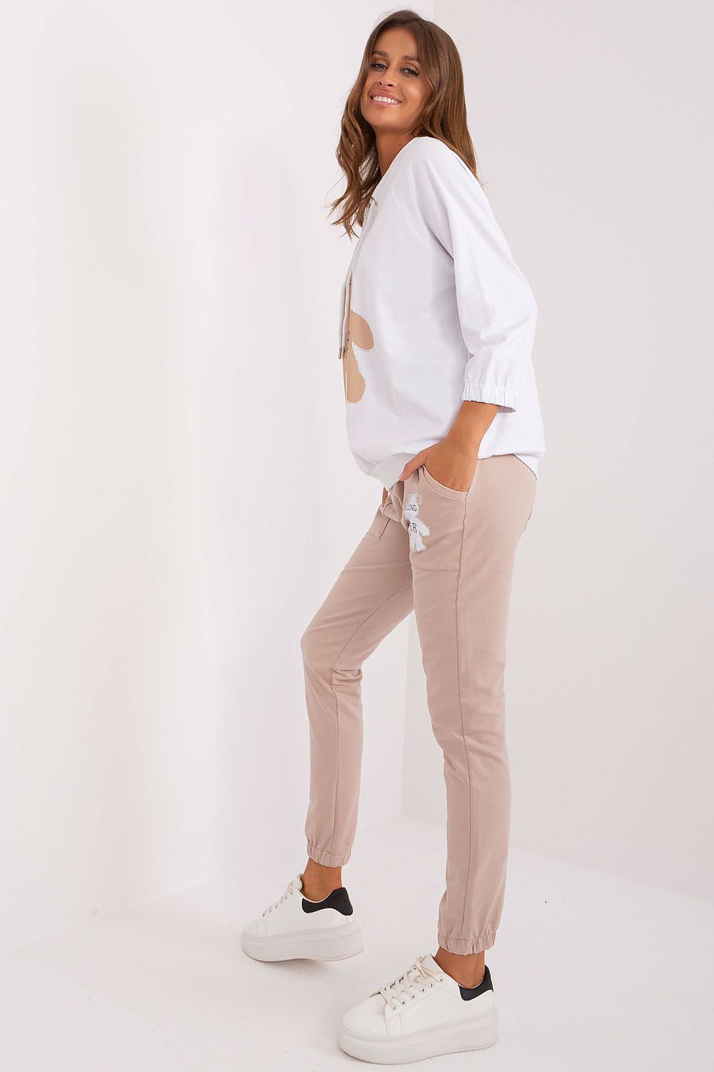 A sweatshirt set consisting of a sweatshirt and pants. Sweatshirt with long sleeves and round neckline. Decorative print in the shape of a teddy bear on the front. Long pants with a tie at the waist and pockets.