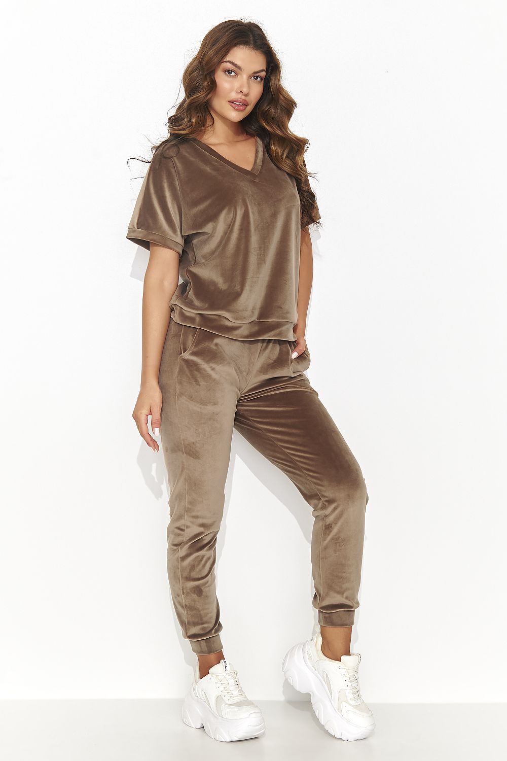 Lightweight women's velour tracksuit set is a combination of comfort and elegance. The set consists of a short-sleeved T-shirt with a v-neck, which adds lightness and subtlety to the whole styling. The long pants with a tapered jogger leg guarantee freedom of movement, while the practical slip pockets make it the perfect outfit for both relaxation and an active lifestyle. Available in three colors, this set allows you to express your individual style. The velour texture adds to its elegance, making it suitable for both casual and more sophisticated occasions. It's a combination of comfort and chic that is sure to make you stand out from the crowd.