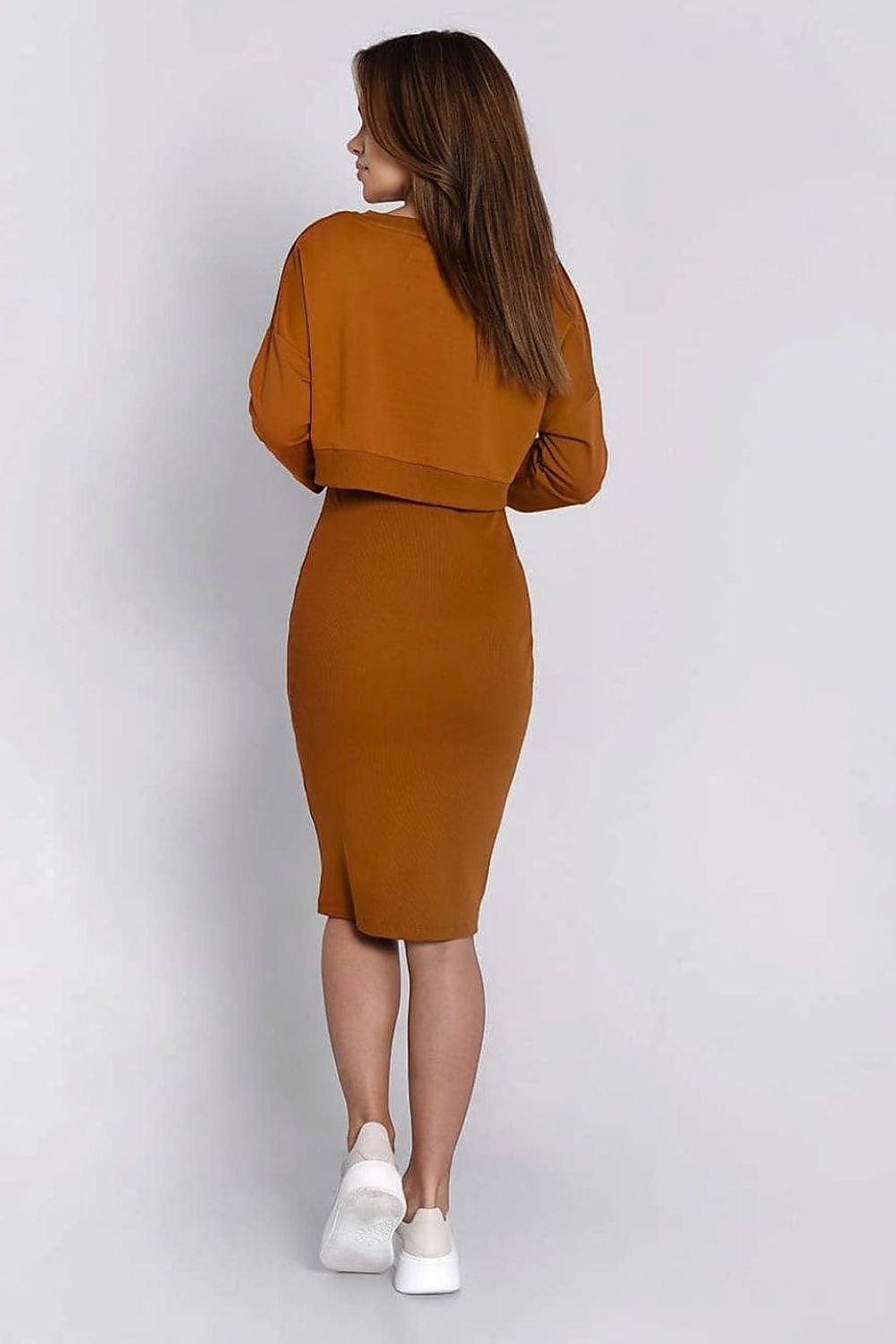 Cotton sports set in taba color. A ribbed mezzo length dress with a V neckline and wider straps. The short oversized blouse with a deep V neckline is finished with ribbed cuffs. This model offers many possibilities for wearing and combining with other items of clothing. Perfect for many everyday casual styling.