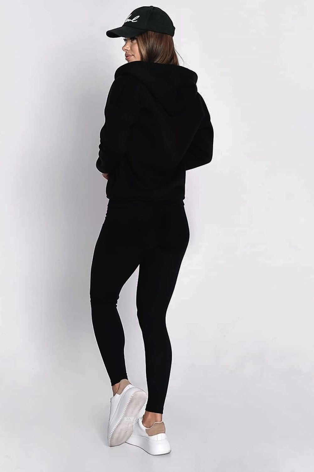 Women's set in black consisting of three pieces, an elastic striped top, striped fabric leggings and an insulated hoodie. The hoodie has a hood and long sleeves. The short is on wide shoulder straps. Leggings with tapered legs, with an elastic waistband. Opt for a comfortable set that will stay with you all year round. Delight with complete freedom!