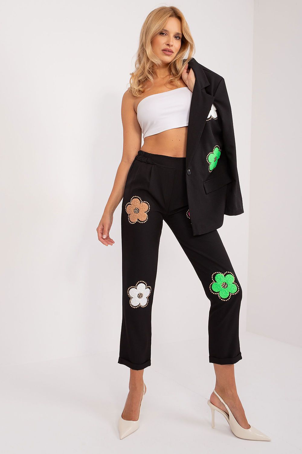 The set of jacket and pants is a perfect combination of elegance and style, which will be perfect for a variety of occasions from work, through business meetings, to special evening outings. Characteristic decorative flowers placed on the front of the pants and jacket add originality and subtle finesse to this set. Made mainly of polyester, the jacket and pants maintain an elegant look while offering freedom of movement. The floral appliqués are a delicate but striking detail that adds a sophisticated touch to the complete set. The long length of the pants and jacket gives the set a formal tone, ideal for more formal occasions. The straight trouser legs and high rise emphasize the classic cut, which is both timeless and stylish. The long sleeves and wide lapels of the jacket add to the overall elegance and make the set suitable for colder days. The side slip pockets in the pants are a practical addition for stowing away essentials. The lined jacket is an element that further emphasizes the quality and comfort of the wearer. It's a comprehensive design approach that combines both aesthetics and functionality. This elegant set with floral appliqués will be perfect for business situations, while adding charm and finesse. This is an excellent choice for women who want to emphasize their individuality and style also in formal circumstances.