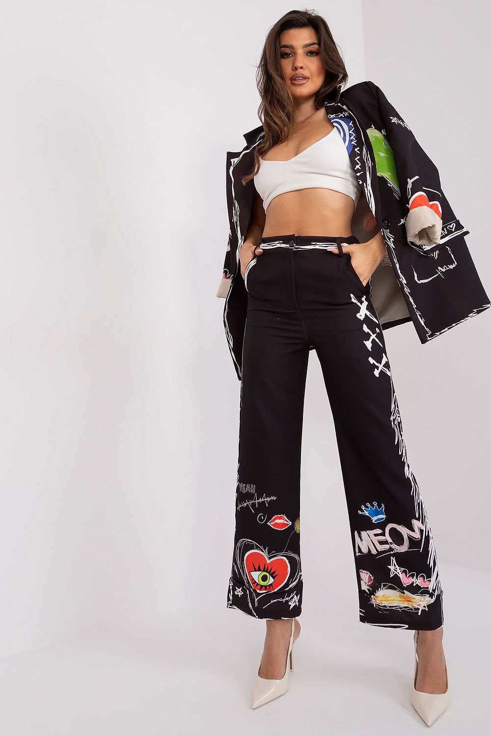 This elegant women's set consists of a jacket and pants, which perfectly combine sophisticated style with comfortable wear. The jacket, with long sleeves and lapels, is buttoned, which gives it elegance and class. Made of high-quality polyester with a lining, it guarantees not only comfortable wear, but also durability and a perfect fit. The pants, long and straight, with a zipper and button closure, feature a high waistband that accentuates the silhouette and adds elegance to the whole look. Their versatile nature makes them suitable for both everyday wear and more formal occasions. The entire set is decorated with a colorful print, which gives it originality and freshness. It is a dominant pattern that attracts attention and adds character to the set. In addition, the slip-in side pockets in the pants are a practical addition, allowing for convenient storage of small items. The long length of the set makes it suitable for different seasons, and the high quality of the materials guarantees durability and wearing comfort. With its elegant design and colorful print, this women's set will be perfect for everyday situations as well as more formal occasions, emphasizing the style and elegance of its wearer.