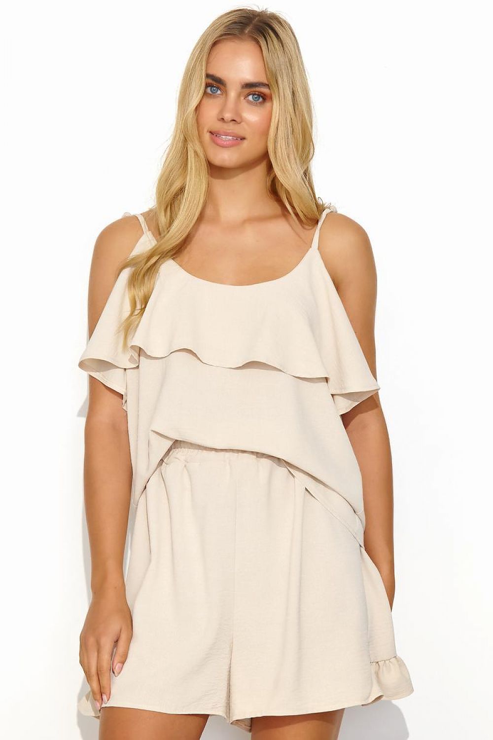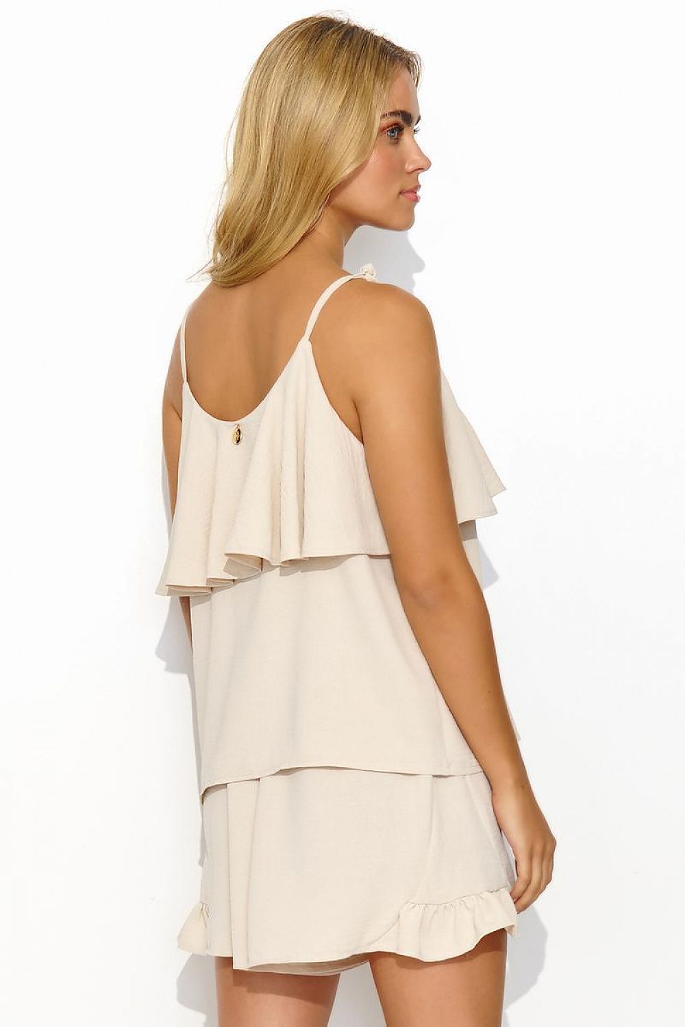 Light and airy women's set, which is a combination of a top and shorts, is an excellent choice for women who appreciate originality and casual style. The strappy top is decorated with a metal plate and a fine frill, which add elegance and sensuality. Loose shorts with a regular top additionally ensure comfort of wearing and a delicate frill sewn on the sides gives them a subtle and romantic character. The women's set, accompanied by appropriate accessories, will create a unique look for various occasions, from casual meetings with friends to more elegant outings. This stylish set comes in baby pink, black, cappuccino and light beige. Regardless of the color you choose, each adds charm and a unique image.