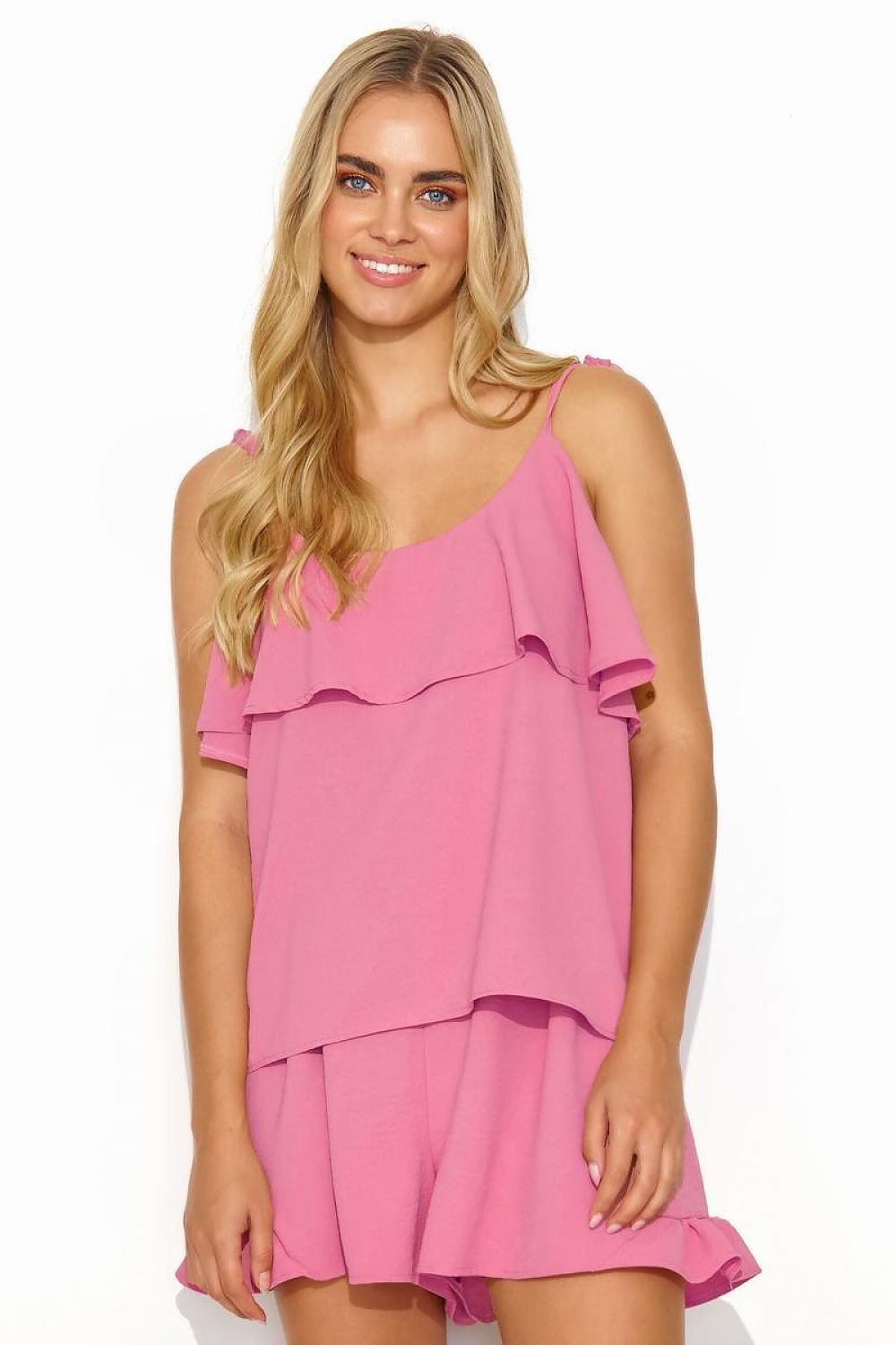 Light and airy women's set, which is a combination of a top and shorts, is an excellent choice for women who appreciate originality and casual style. The strappy top is decorated with a metal plate and a fine frill, which add elegance and sensuality. Loose shorts with a regular top additionally ensure comfort of wearing and a delicate frill sewn on the sides gives them a subtle and romantic character. The women's set, accompanied by appropriate accessories, will create a unique look for various occasions, from casual meetings with friends to more elegant outings. This stylish set comes in baby pink, black, cappuccino and light beige. Regardless of the color chosen, each adds charm and a unique image.