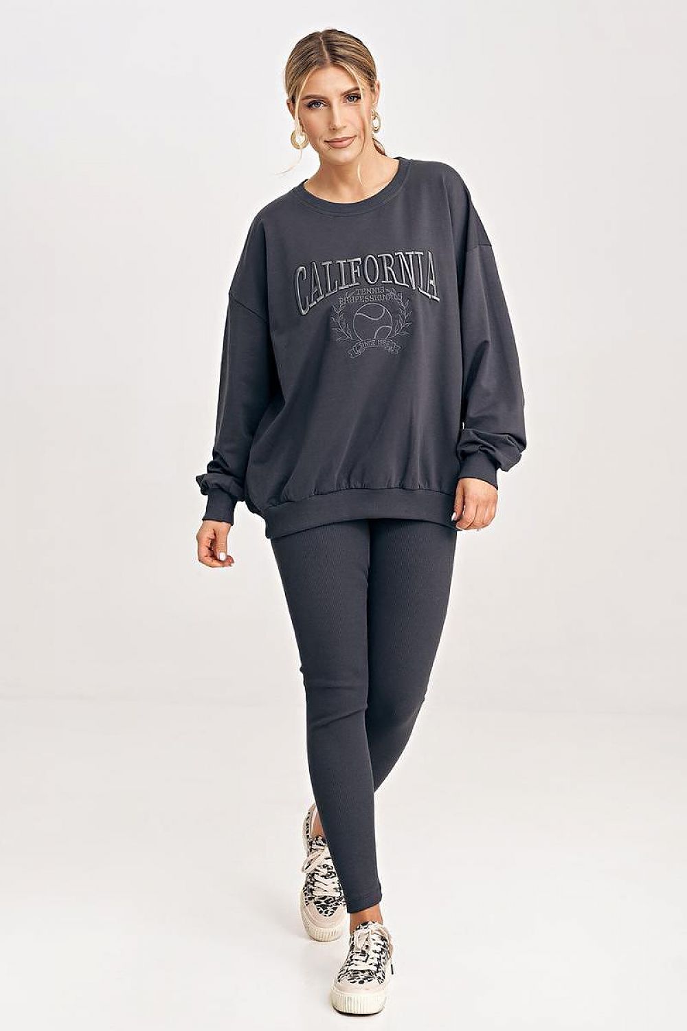 A tracksuit set consisting of a sweatshirt and leggings. Extended sweatshirt with long sleeves and a round neckline. Long leggings with an elastic waistband. Universal size for people wearing size S or M.