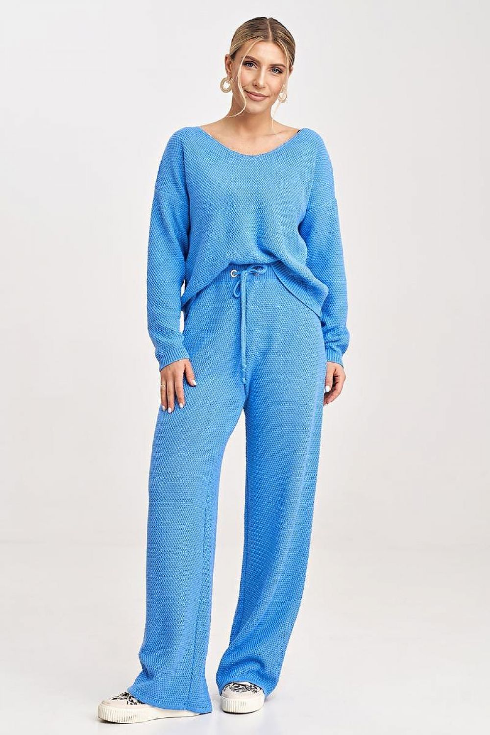 Set consisting of a sweatshirt and pants. Long loose pants with a tie at the waist. Sweatshirt with long sleeves and a wide neckline.