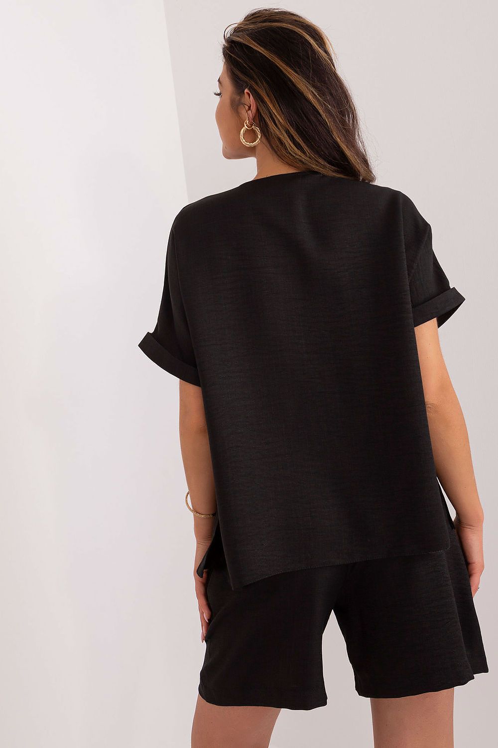 This elegant yet casual women's set consists of a shirt and shorts, perfect for everyday outings. The smooth design and combination of cotton and polyester ensure comfort and durability. The knee-length, wide-legged, high-waisted shorts accentuate the silhouette, while the side pockets add practicality. The shirt's short sleeves and v-neck add lightness and summer style, while the buttons on the front allow for easy donning. It's the perfect choice for warm days, combining comfort and a fashionable look.