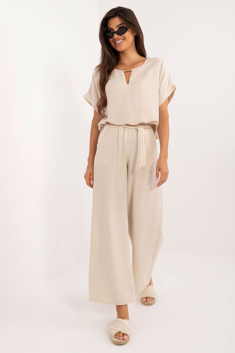 This casual set consisting of a blouse and pants is an ideal choice for everyday styling and for work. Made of dominant viscose, it provides comfort and breathability throughout the day. Smooth material in a solid color gives the set an elegant, yet casual character. The blouse with short sleeves and a round neckline is perfectly matched with long pants with wide legs. The high-waisted pants emphasize the waist, while the tie belt adds a stylish touch. Practical side slip pockets increase functionality. It's a versatile ensemble that's perfect for the office and everyday wear.