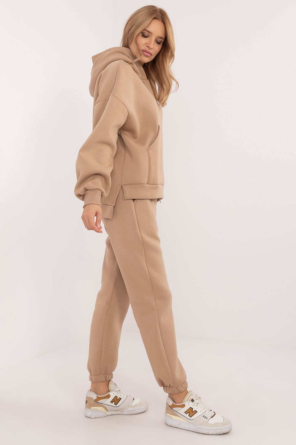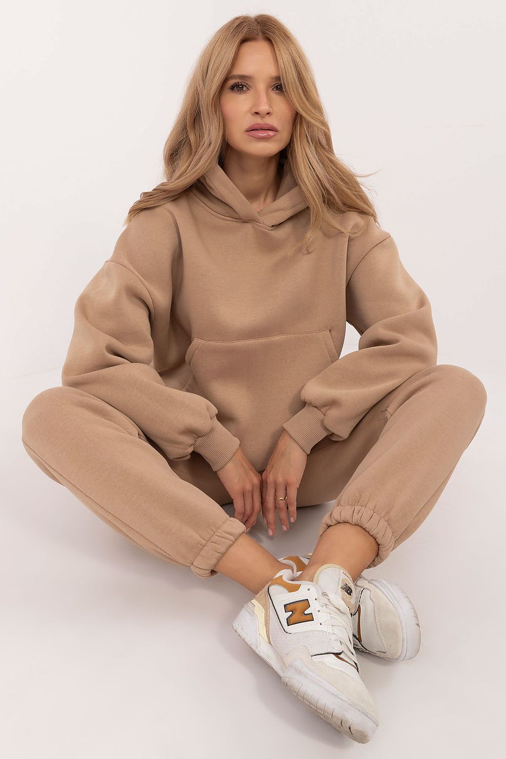 The warmed-up women's casual sweatshirt set, ideal for everyday colder days, consists of a sweatshirt and pants. The set is made of a soft and warm blend of cotton and polyester for comfort and durability. The sweatshirt has long sleeves, a hood and a large, practical kangaroo pocket, which adds a sporty touch and functionality. Thanks to its insulation, the sweatshirt is ideal for cold days, and its plain pattern adds a classic, versatile look. The long-leg pants, which end in ribbed cuffs, have a high waist to accentuate the waist and ensure comfort. There is a tie at the waist for a perfect fit. In addition, the pants have slip-in side pockets, making them a practical choice for everyday wear. The whole set combines style, comfort and warmth, being an excellent choice for casual styling.