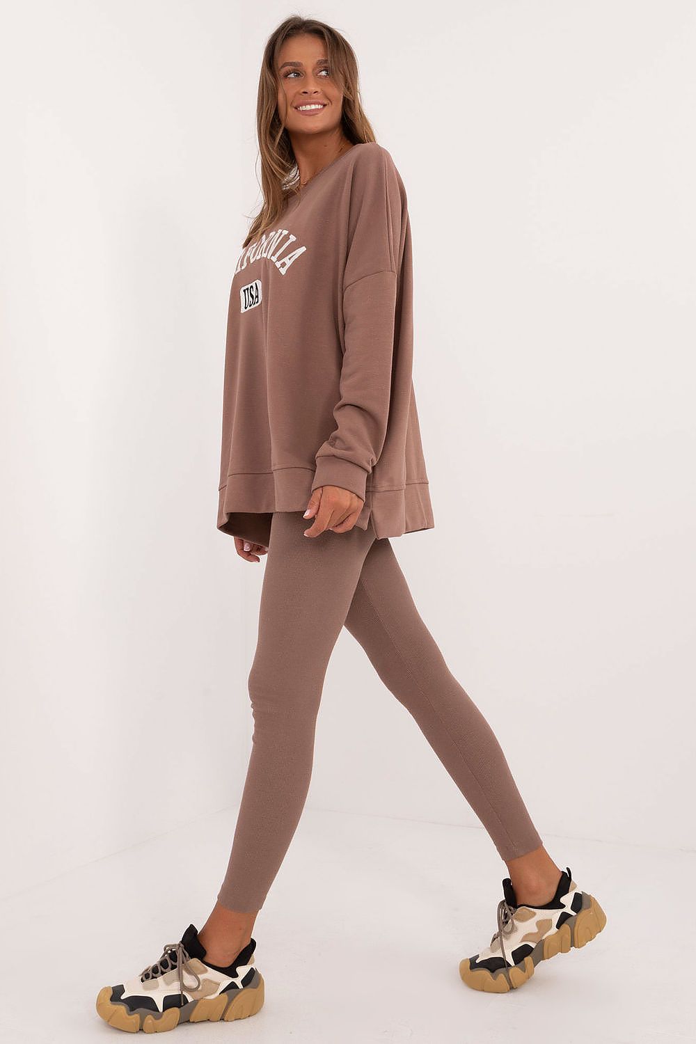Women's casual set consisting of a sweatshirt and leggings, perfect for everyday occasions. The long cut sweatshirt has a print with inscriptions on the front, adding a modern touch to the styling. Comfortable leggings made of ribbed material perfectly fit the figure, while their tapered legs and high rise emphasize the figure and ensure comfort in wearing. The blouse with long sleeves and round neckline provides warmth and freedom of movement. This set is an excellent choice for women who appreciate comfort and style in everyday styling.