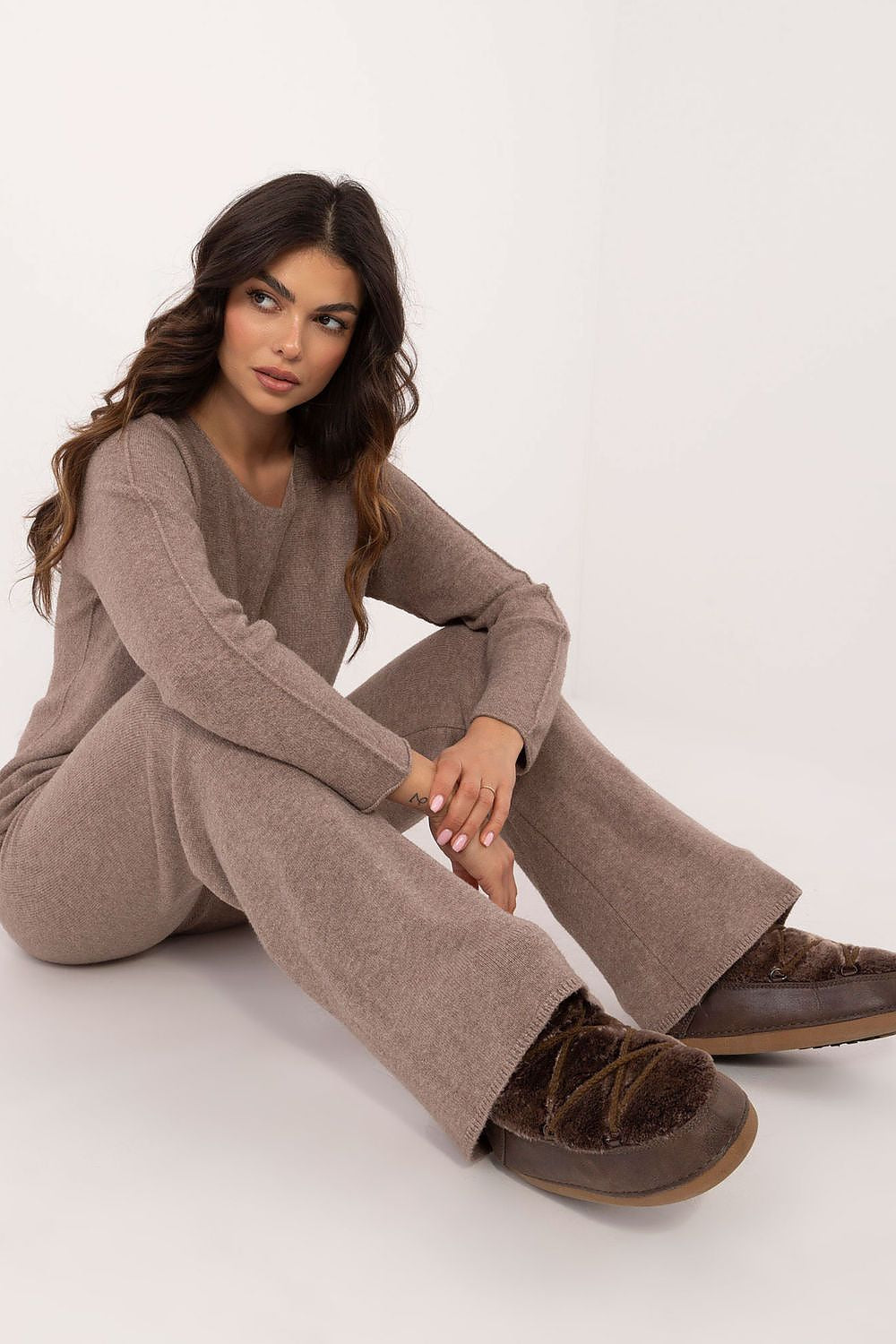 Casual sweater set, consisting of a comfortable sweater and pants, ideal for everyday styling. Made from a soft blend of viscose, polyester and nylon, it provides comfort and a pleasure to wear. The smooth texture of the material adds a modern, minimalist look to the set. The sweater has long sleeves and a round neckline for a classic, versatile fit. The wide-legged, high-waisted pants perfectly shape the figure, and the lack of pockets gives them a clean, elegant line. This is a stylish and comfortable everyday set, perfect for a walk, work or relaxing at home.