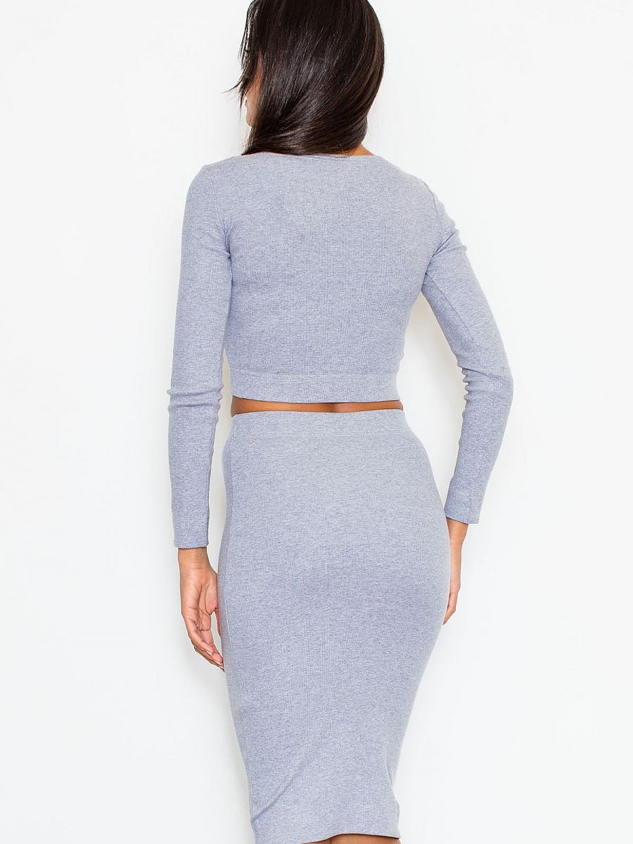 A sensational women's set consisting of a short top with long sleeves and a skirt. The short top seductively exposes a belly, and a contrasting belt sewn on the bust line cleverly emphasizes feminine assets. The skirt is midi, with a classic pencil shape. The proposed set is very sexy and presents a strong character of each stylisation.