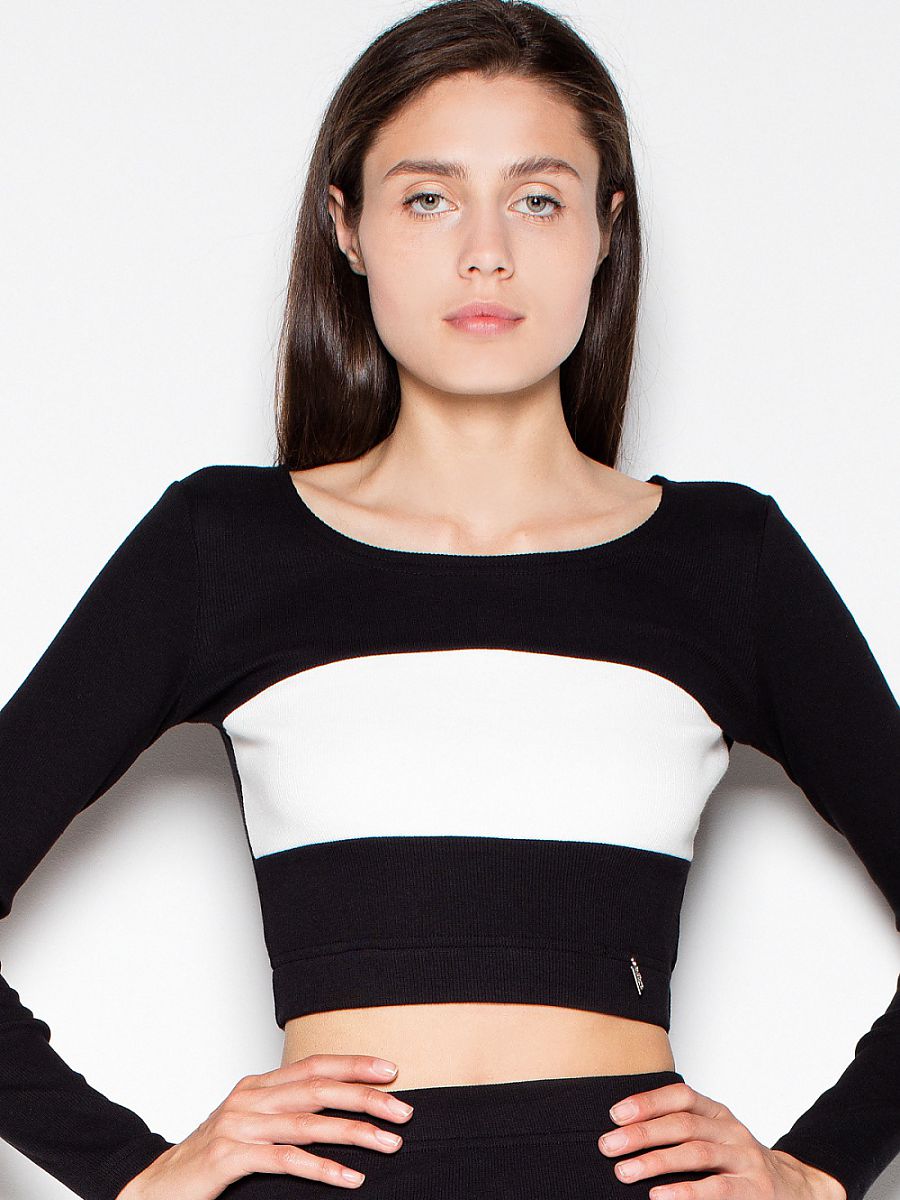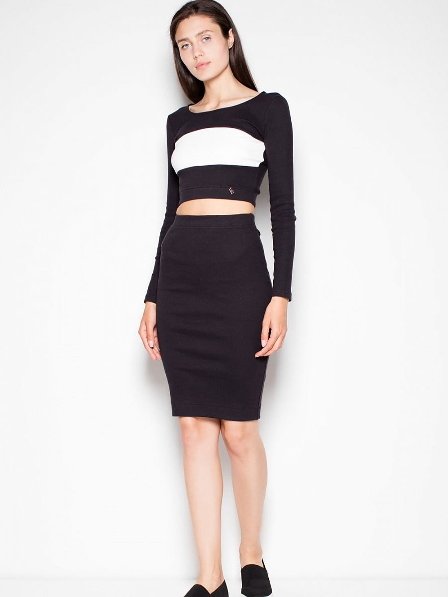 Cotton set. Long-sleeved crop blouse with a decorative belt in a contrasting colour and a classic cut pencil skirt.