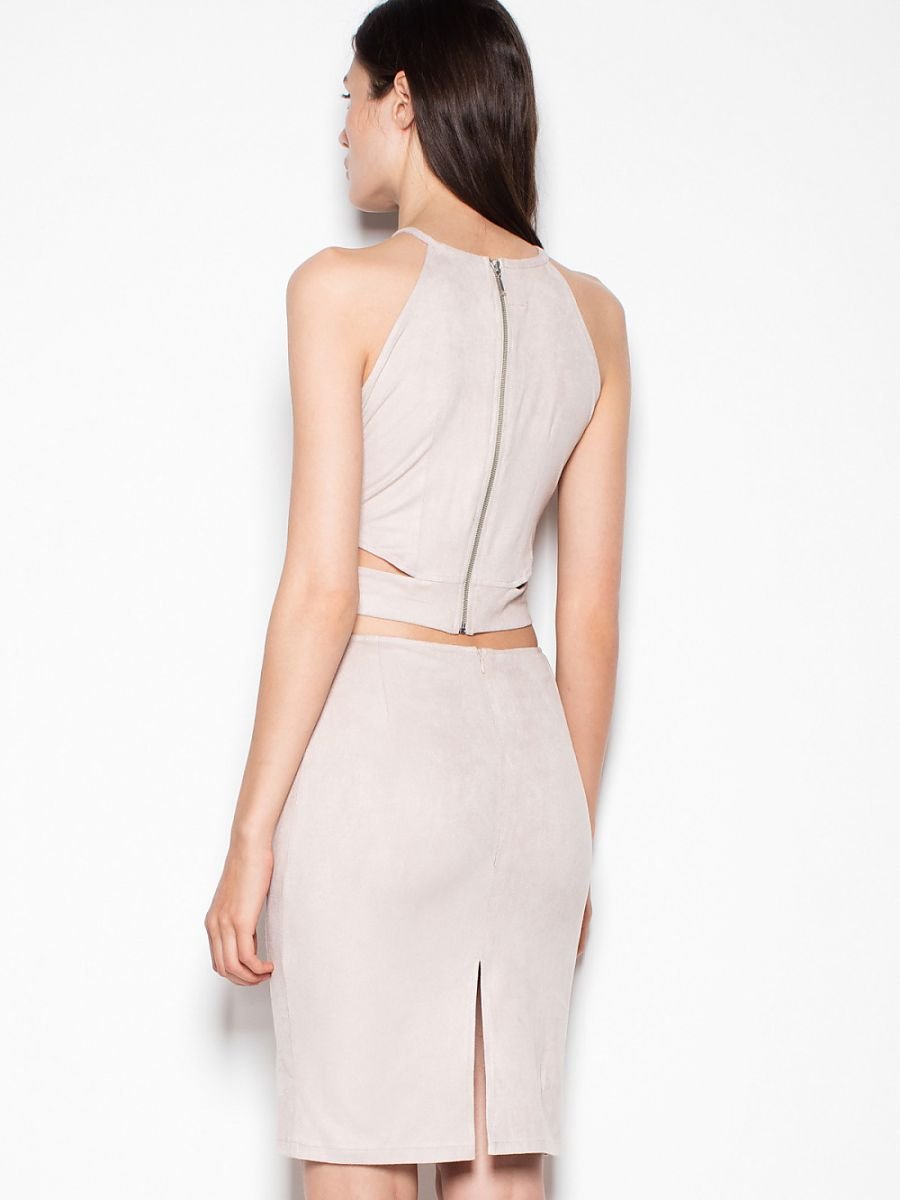 Elegant suede set: fitted skirt before the knee and a strappy blouse with original triangular cut-outs on the sides. Model with an original cut.