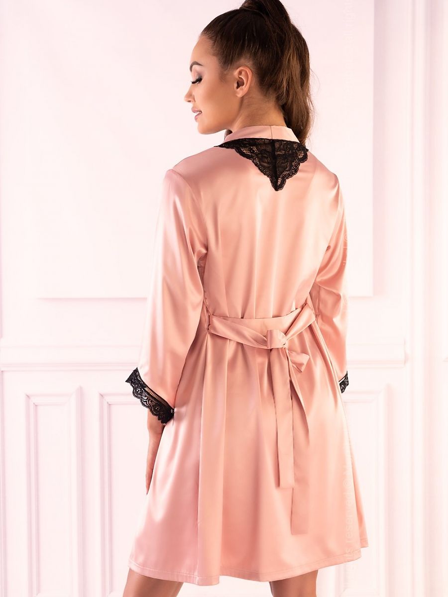 Impressive, very feminine robe made of satin in beautiful pink colour. The model is enriched with a black lace insert that can be seen on the cuffs and at the back, in the upper part of the robe. Tie at the waist. The thong is included in the set.