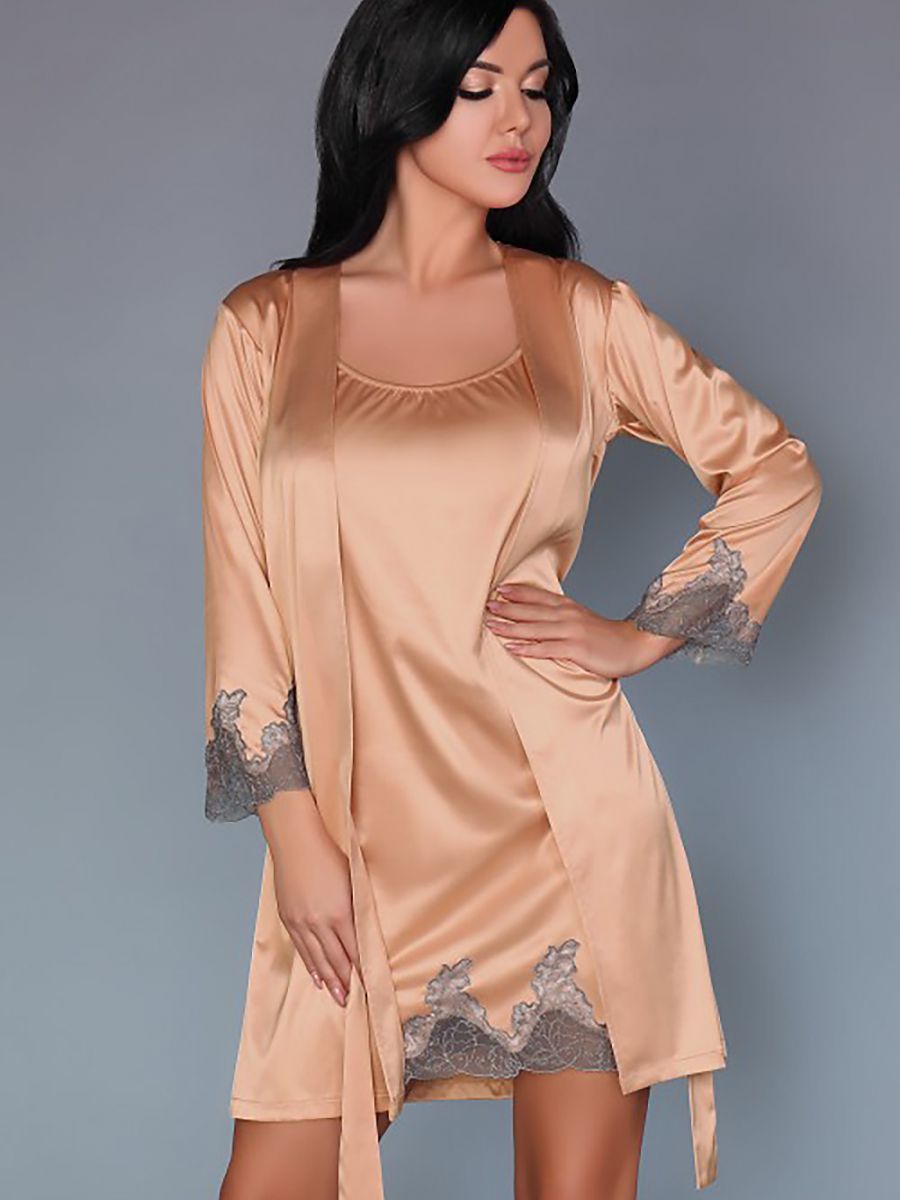 A very feminine set - sensual nightgown in duet with a dressing gown. This is the ideal way to welcome the evening after a long tiring day at work. A delicate colour in a fashionable shade, subtle lace decorations on the edges and incredible femininity inscribed in the design - that is what awaits you here. The chemise has a neckline on the back, dressing gown with strap.