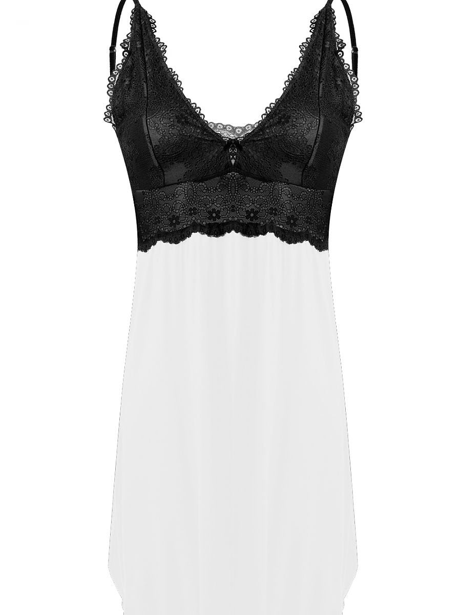Sensual and elegant - Cindy chemise, available in several colours, but always with a black lace top. Deeply cut neckline, cups lined with fabric, a real explosion of femininity... Bottom delicate, loose, made of soft viscose.