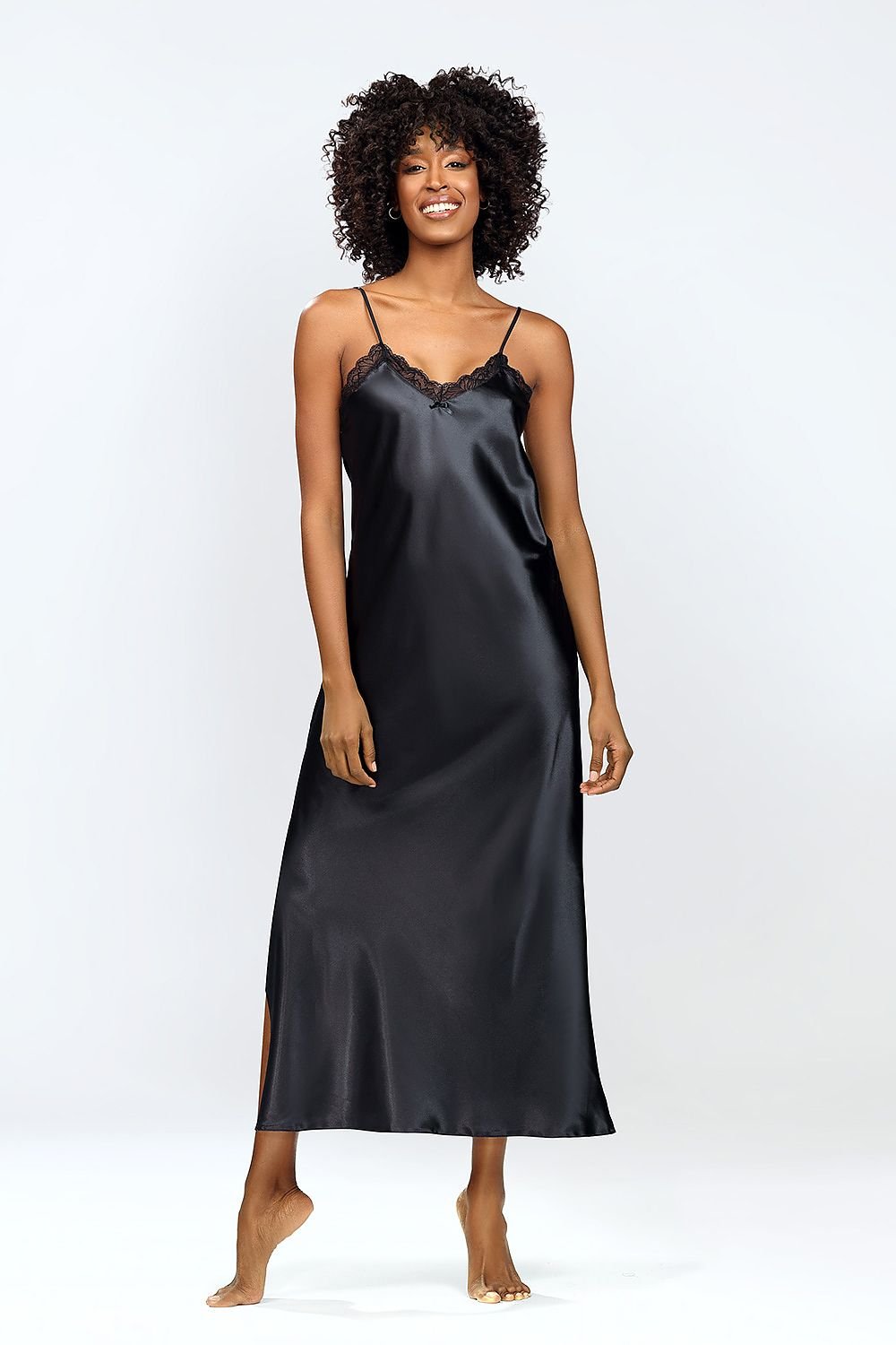 The Abeni nightgown is classic and elegant in one. The long satin nightgown has a subtle lace trim that gives it sensuality. The slip has two strong cutouts on the sides. Its classic cut makes every woman feel elegant and comfortable in it.
