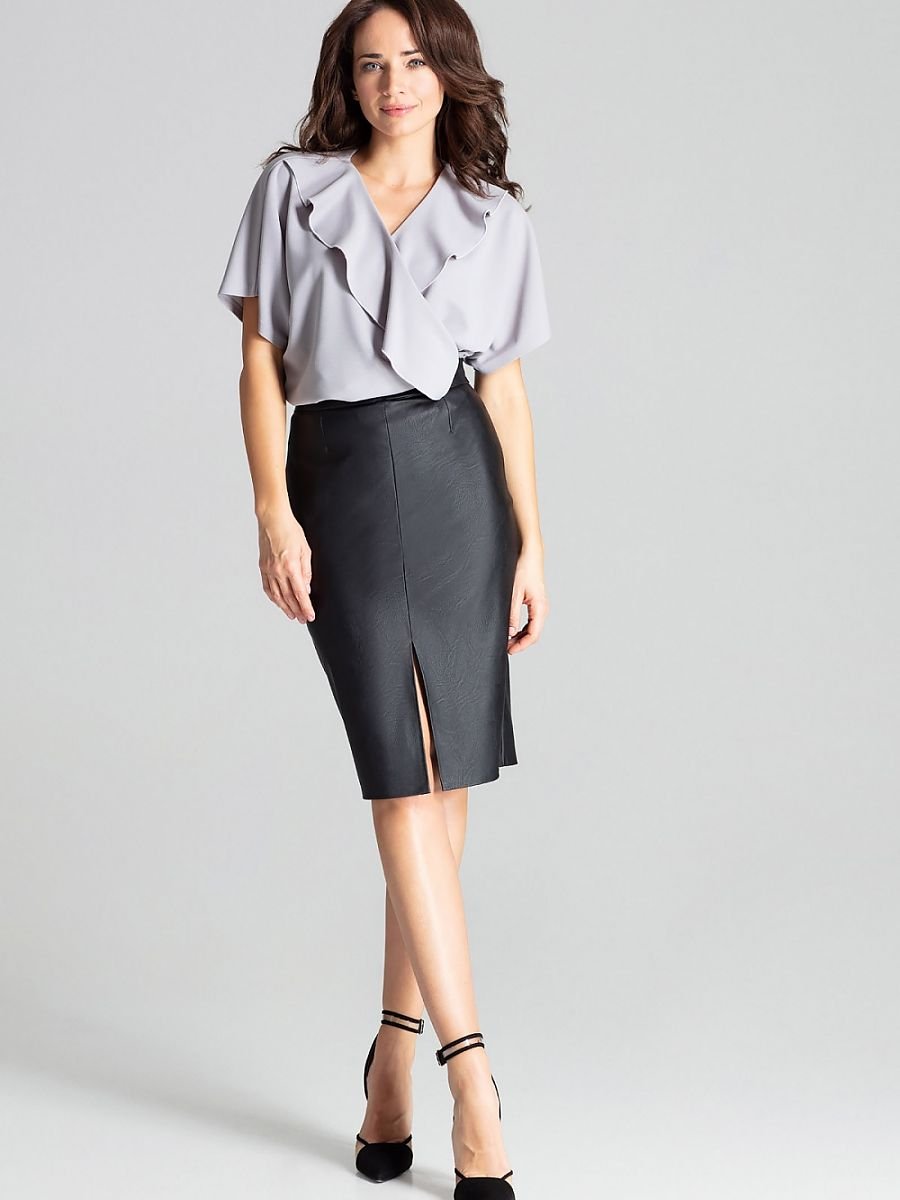 Grey body with falling, kimono short sleeves. Envelope neckline with decorative ruffle.