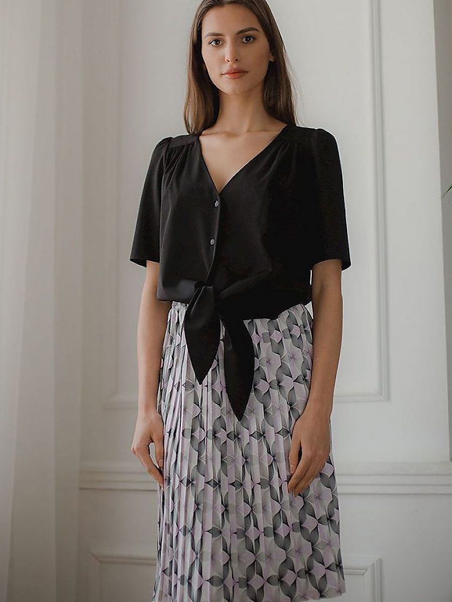 Black short straight shirt with a heart neckline, buttoned at the front, decorative binding at the bottom of the shirt. Short sleeves, creased at the shoulders.