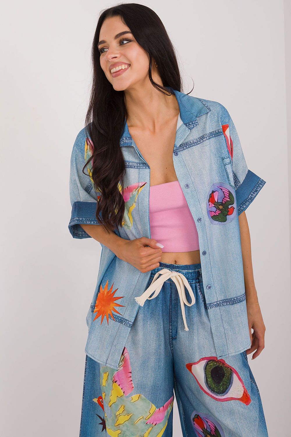 Casual women's shirt, ideal for everyday wear, distinguished by a colorful print that adds energy and style. Made of viscose with added polyester, it provides comfort and breathability, ideal for warmer days. The shirt has an asymmetrical length, short sleeves with a rolled-up cuff and a classic collar, which gives it an elegant look. The front button closure makes it easy to put on and adds practicality. This shirt is an excellent choice for women who appreciate stylish yet comfortable everyday wear.