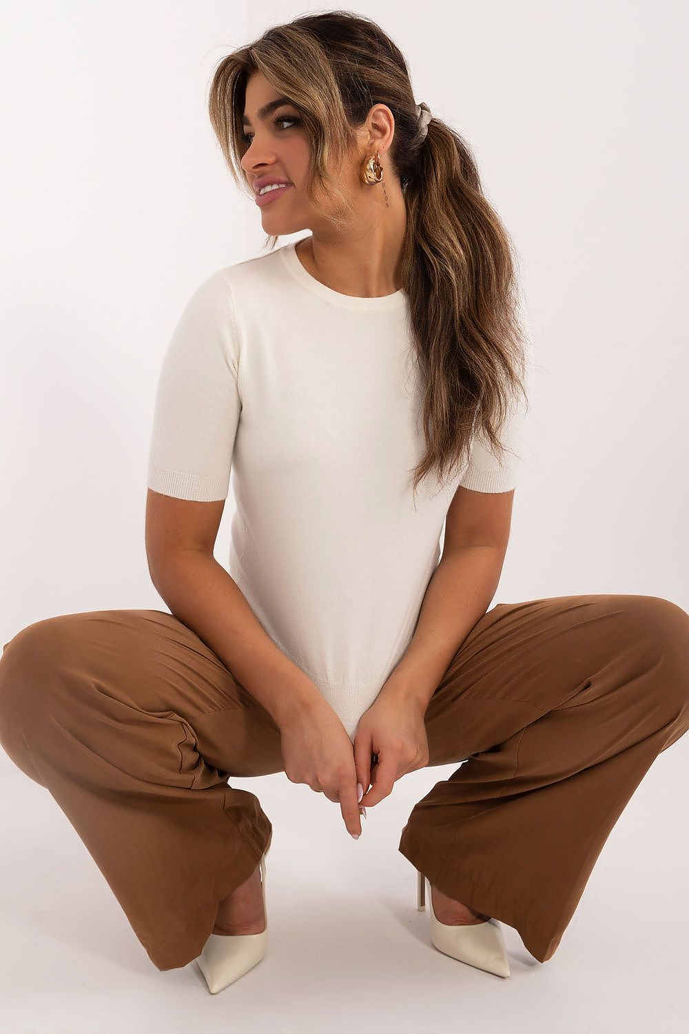 Women's short-sleeved sweater in a casual style, perfect for everyday wear and work. Made of high-quality viscose with the addition of elastane and polyamide, which provides softness and comfortable wearing. The sweater is characterized by a smooth, uniform pattern, which adds elegance and versatility. It has a classic, round neckline, emphasizing the neck. Its standard length makes it easy to match with different stylizations, being an ideal choice for daily, comfortable wearing.