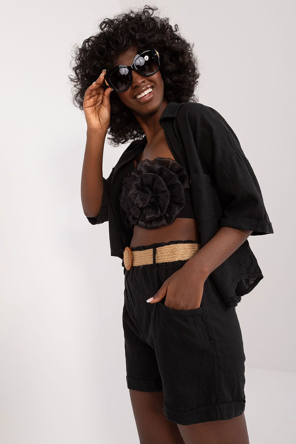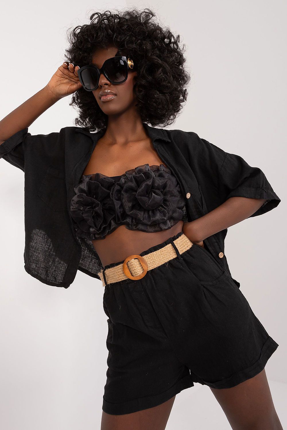 These women's shorts are the perfect choice for everyday summer days, providing both style and comfort. Made of linen fabric with a touch of cotton, they are airy and pleasant to wear, perfect for warm days. The shorts have a simple, classic leg cut, giving them a versatile look perfect for a variety of occasions. Equipped with a buckled waistband, they allow you to adjust them to your figure, emphasizing your waist. Slip-in pockets add functionality, allowing you to store small items during daily activities. The casual style and solid color of the material make them suitable for a wide variety of outfits, blending perfectly with your daily closet. In addition, their high rise makes them not only fashionable, but also comfortable to wear, providing comfort and confidence during any activity. Perfect for a stroll around town, shopping or meeting with friends, these shorts will be a reliable part of your summer closet.